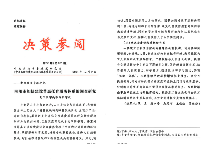 校党委副书记、校长范真领衔的智库研究成果《南阳市加快建设普惠托育服务体系的调查研究》荣获2024年度南阳市智库研究一等奖,报告被市委政策研究室《决策参阅》全文刊发。范真团队聚焦系统破解“幼有所育”民生难题,深入调研南阳市托育服务发展现状,系统剖析区域发展不均衡、师资力量薄弱、行业标准缺失等痛点,提出“强化顶层设计、完善人才队伍、构建多元供给体系”等多项创新对策。该研究立足国家生育支持政策导向,融合上海、广州等地“社区嵌入式托育”“公建民营”等模式和国外经验,建议通过设立专项基金、推动校企联合育人、建立智慧监管平台等举措破解发展瓶颈。此外,科研处孟娅琪老师《加强中医药行业高能级科创平台构建助力南阳建设中医药发展先行区》的研究获评三等奖。