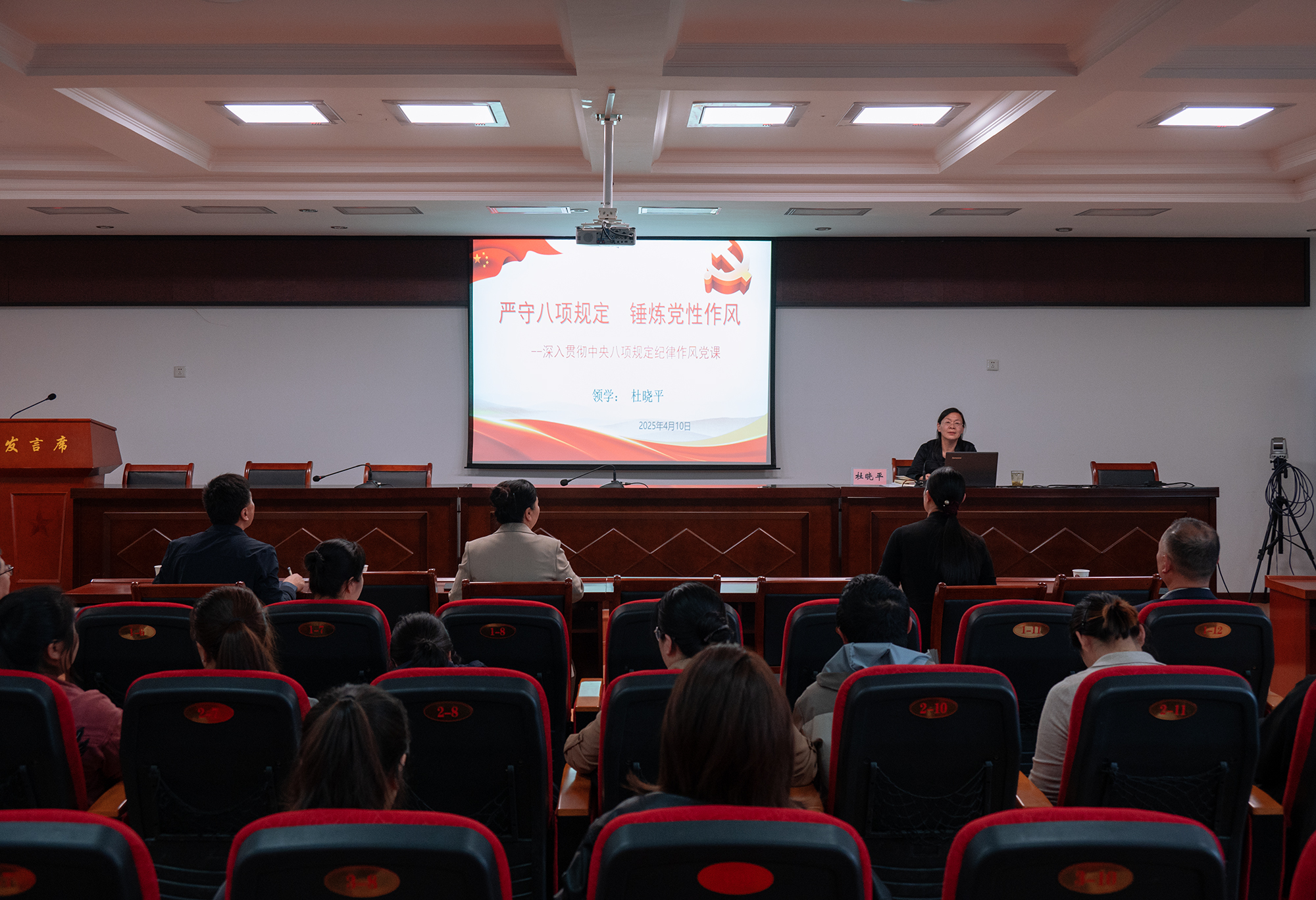 杜晓平结合当下正在开展的深入贯彻中央八项规定精神学习教育,从学习教育背景、领会重要论述、贯彻八项规定三大方面展开讲解,深入阐述学习教育的整体规划、党的纪律和作风、贯彻中央八项规定等重点内容。她号召全体同志以中央八项规定精神为纲,守好立德树人初心,练就教书育人本领,担起为党育人、为国育才使命,为党的事业和学校的发展不断贡献力量。(编审 华俊皓)