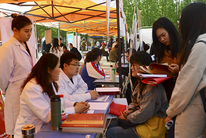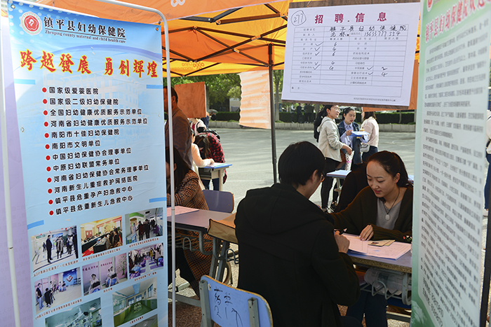 北京方舟医院、北京皇城股骨头坏死专科医院、河南宏力医院、河南信合医院、平顶山市中医院、潢川县妇幼保健院、洛宁县人民医院、固始县中医院、息县人民医院、光山县人民医院、桐柏县中心医院、南阳市胸科医院、南阳油田总医院等260多家医院参加本次招聘,占参会单位的80%以上。用人单位认为,我校毕业生理论基础扎实,动手能力强,适应环境快,能够在短时间内进入工作状态赢得了用人单位的亲睐,往届已就业的毕业生大多是单位业务骨干,有些已走向领导岗位。卧龙区武装部王金保部长亲临招聘会现场为我校大学生宣传征兵政策。招聘会现场人来人往,川流不息,场面壮观,秩序井然。15日下午,有40余家用人单位对有意愿到单位工作的毕业生进行了宣讲、面试。从招聘会专业需求情况来看,护理、临床医学、中医骨伤、针灸推拿、康复治疗技术、药学、医学影像技术专业毕业生需求量较大,成了众多单位招聘的重点专业。