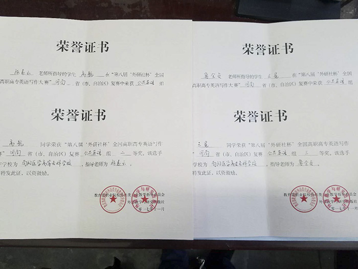 本网讯(文/公教部 许可)10月21-22日,第八届“外研社杯”全国高职高专英语写作大赛河南赛区比赛在河南建筑职业技术学院举行。我校护理系高航和临床系王冕两位学生分别获得省赛区二等奖和三等奖的优秀成绩,辅导教师获得相应荣誉。