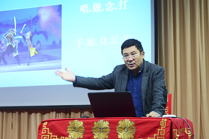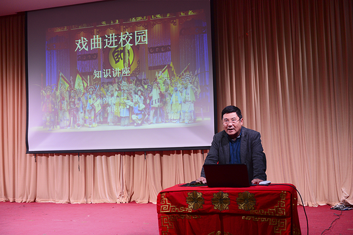 演出之前,由河南豫剧院一团国家一级演员、省戏曲导演李庚春为大家作了“戏曲知识专题讲座”。他从戏剧的由来谈起,重点讲述了豫剧的历史渊源、名人名剧、流派分支、表演体系及四功五法等戏曲常识,并为大家示范了唱、做、念、打等基本表演技巧,让在座师生大开眼界、受益匪浅。