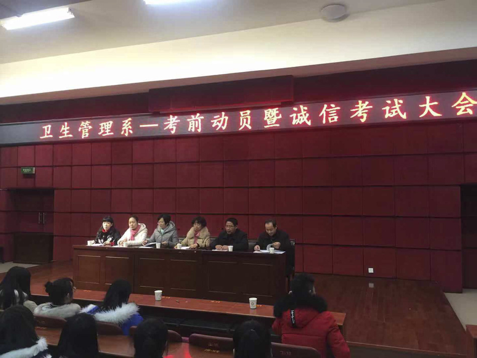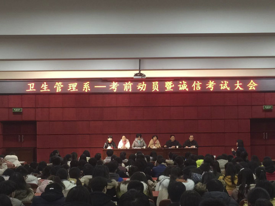 本网讯(文/卫生管理系 何伟峰)期末考试临近,为进一步加强校风学风建设,端正考风,严肃考纪,营造文明、严肃、诚信的良好考场氛围,积极传递“端正学习态度,诚信应对考试”的理念,12月25日下午,卫生管理系2018-2019学年第一学期考前学习动员暨诚信教育大会在图书馆五楼报告厅召开,卫管系领导班子所有成员、辅导员、班主任和全体学生参加大会。大会由卫生管理系副主任常梦星主持。
