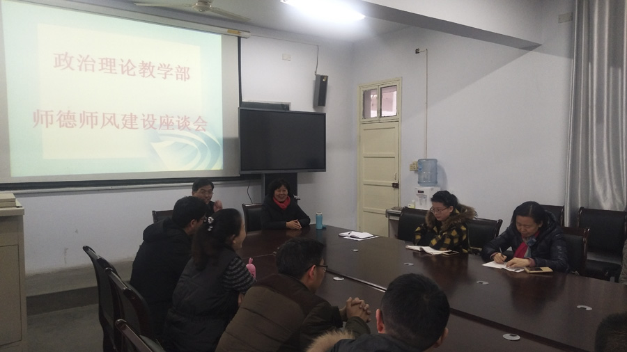 本网讯(文/政教部 雷雨泰)为进一步加强我校思政课教师的师德师风建设,打造一支师德师风优良的专业教师队伍。2月27日下午,在全校师德师风培训会后,政教部特别邀请到南阳师院党委委员、副校长孔国庆教授与政教部全体教师进行座谈交流。座谈会由冯晓青主任主持,政教部全体教师参加。