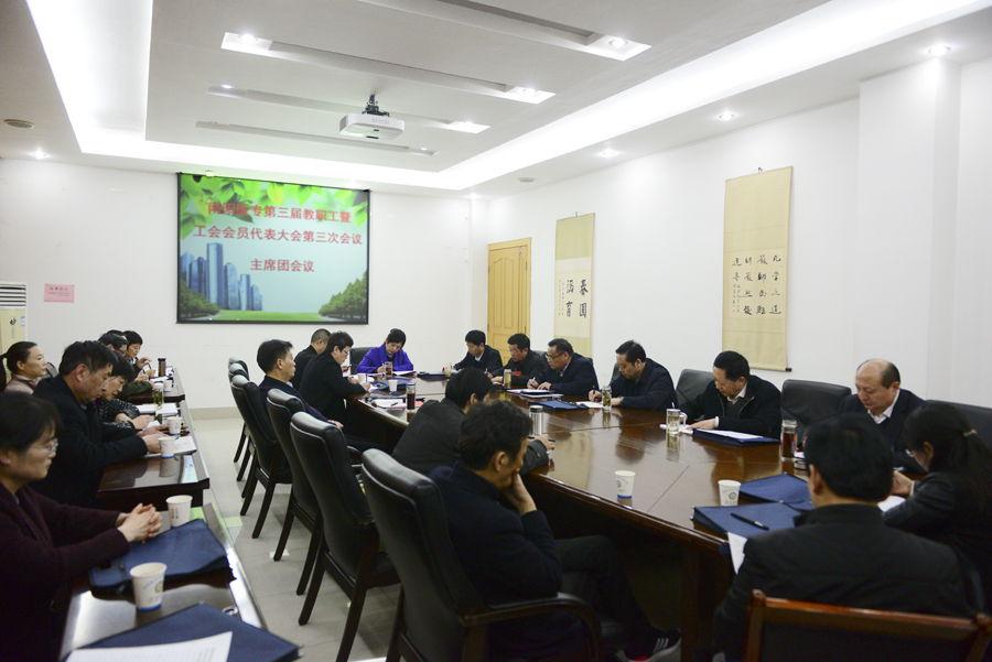 本网讯(文/校工会 朱东民)我校第三届教职工暨工会会员代表大会第三次会议于3月24日在图书馆五楼报告厅隆重举行。校党委书记全新明、校长方家选以及逵应坤、张国良、张胜海、郭万周、田端、范真等校领导在主席团前排就坐,出席大会代表123人。会议听取、审议、通过了《学校工作报告》《工会工作报告》《南阳医专2018年度财务预算执行情况及2019年度财务预算报告》。
