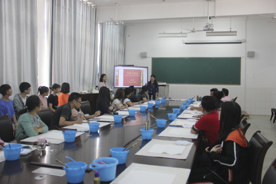 5月20日下午,我校合作院校交流师生在4号教学楼408教室学习体验国画艺术。临床医学系仵湘君老师讲授并现场示范,刘佰蕾老师担任翻译。仵老师结合国画作品简要介绍了国画的类型,讲解了羊毫笔用笔技巧。随后,现场创作国画牡丹并教授如何进行绘画。绘画过程中,仵老师依次进行指导。(编审/李峰松 摄影/国际教育学院)