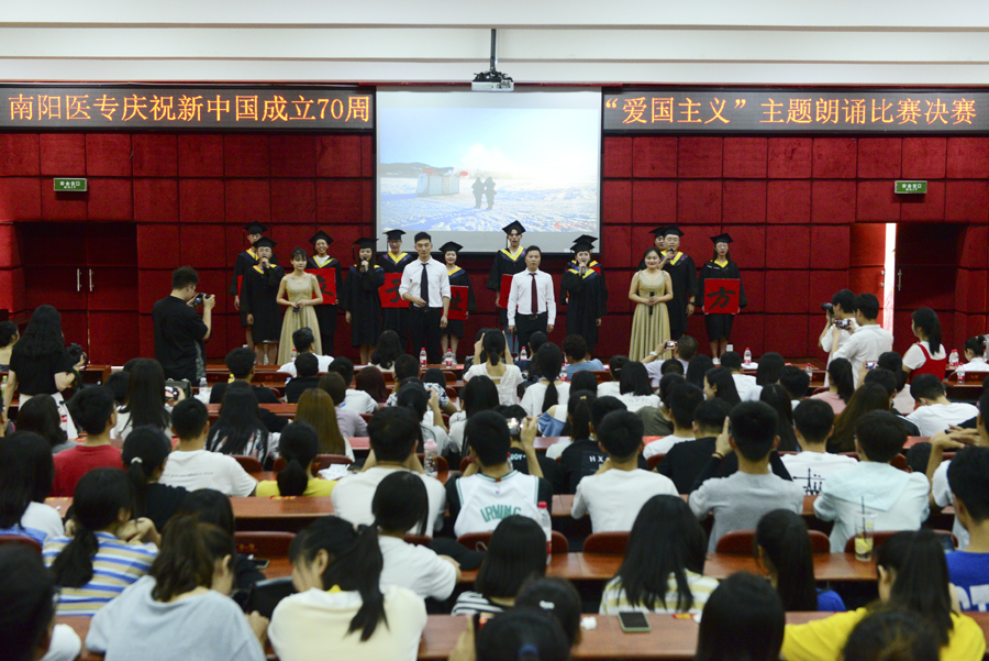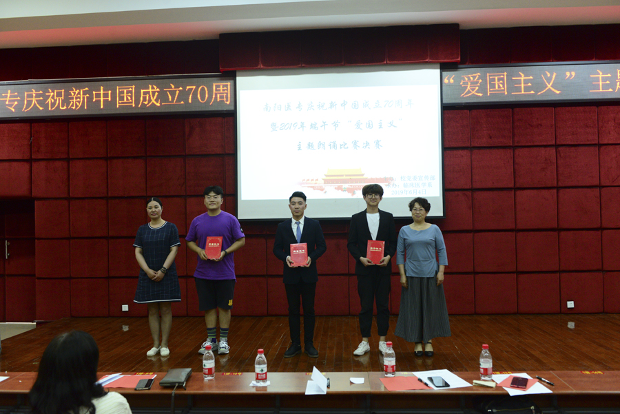 本网讯(文/临床医学系 王静)为深入贯彻落实党的十九大和全国、全省教育大会精神,传承中华优秀传统文化,大力弘扬以爱国主义为核心的民族精神,引导广大师生树立正确的历史观、民族观、文化观,进一步增强文化自信,培养爱国之情,6月4日,我校在图书馆五楼报告厅举办庆祝新中国成立70周年暨2019年端午节“爱国主义”主题朗诵比赛。校党委副书记逵应坤出席活动并致辞;党办副主任王萍、组织部副部长孙超丽、宣传部副部长杨金运、工会女工文体部主任白峰、临床系辅导员刘岩担任比赛评委;各系部院师生300余人观看了比赛。