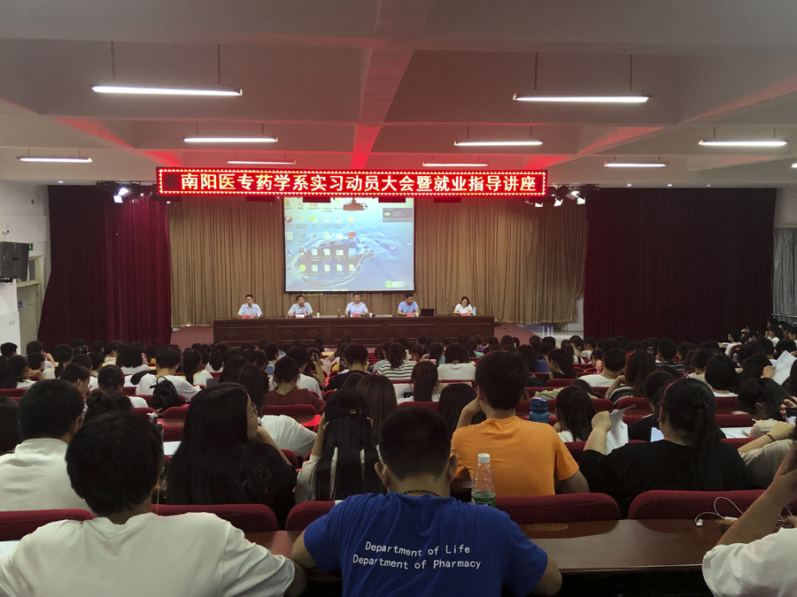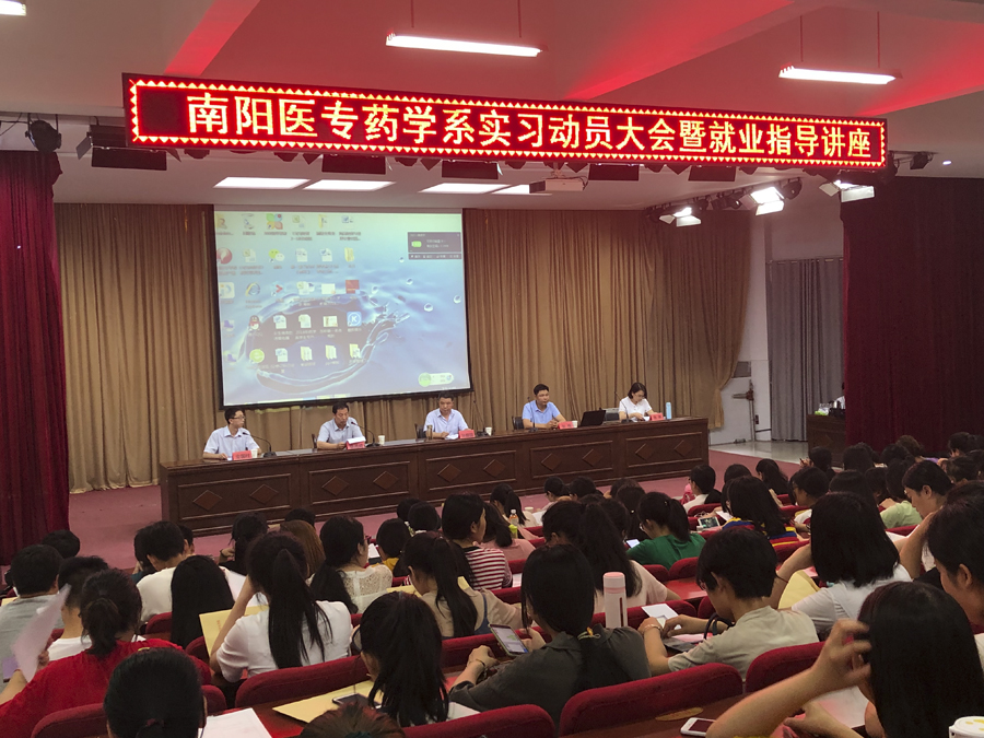 本网讯(文/药学系 陈静)6月4日晚上,药学系在仲景东区报告厅召开了2020届毕业生实习动员大会暨就业指导讲座。药学系党总支书记孙振国、药学系副主任查道成、学生处就业科科长张辉、药学系学工办主任金国柱、优秀教师代表张琳、药学系全体辅导员班主任和2020届毕业生参加会议。会议由学工办主任金国柱主持。