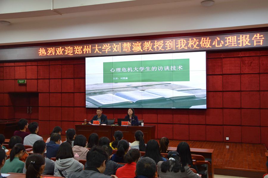 本网讯(文/学生处 褚婉玉)11月1日下午,我校在图书馆五楼会议室举行《心理危机大学生访谈技术》讲座,郑州大学心理健康教育中心副主任、博士生导师刘慧瀛教授主讲,各系院书记,辅导员和各系学生会心理部全体成员参加。学生处副处长余飞海主持讲座。