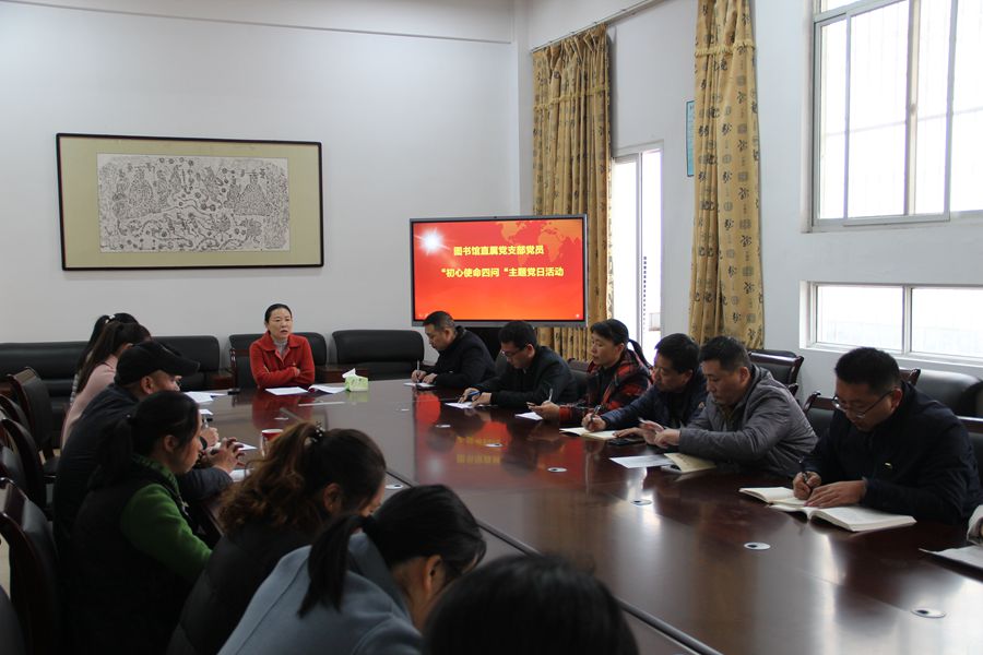本网讯(文/图书馆 夏世龙) 11月20日上午,图书馆直属党支部组织开展党员“初心使命四问”主题党日活动,全体党员参加活动,活动由党支部书记周青玲主持。
