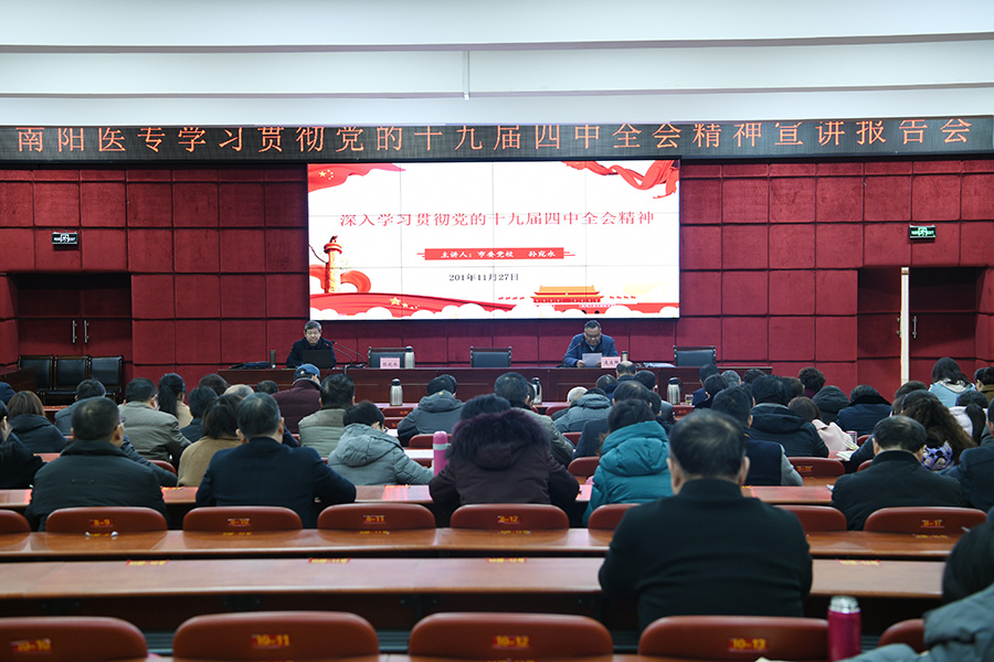 本网讯(文/宣传部 潘晓红)11月27日下午,我校在仲景西区图书馆五楼报告厅举行学习贯彻党的十九届四中全会精神宣讲报告会。特邀市委十九届四中全会精神宣讲团成员、市委党校常务副校长孙宛永作宣讲报告。校本部副科级以上干部,一附院书记、院长,二、三附院副科级以上干部参加了报告会,报告会由党委副书记逵应坤主持。