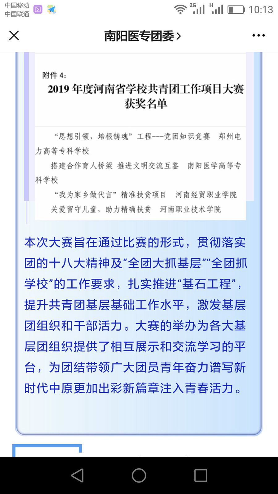 (文/校团委)为深入学习贯彻习近平新时代中国特色社会主义思想和党的十九大精神,深入学习习近平总书记关于青年工作的重要思想,贯彻落实团的十八大精神,坚持立德树人,落实“全团大抓基层”“全团抓学校”工作要求,按照“建强基层组织、夯实基础工作、提升基本能力”的工作思路,扎实推进“基石工程”,提升基层基础工作水平,激发基层团组织和干部活力,团结带领广大团员青年奋力谱写新时代中原更加出彩新篇章,共青团河南省委举办了2019年度“活力杯”河南学校共青团基层基础工作大赛。