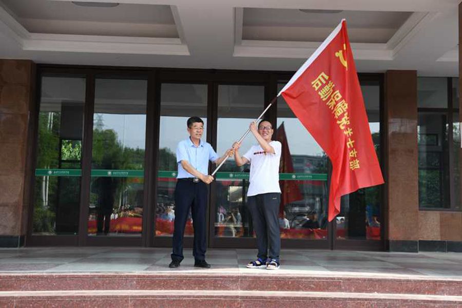 在7月6下午,机关三、五、七支部和保卫处直属支部联合举行“牢记初心使命、争当出彩先锋”主题党日活动启动仪式,党委委员、副校长张国良和郭万周分别为党员志愿服务队、车辆保障党员志愿服务队、后勤保障党员志愿服务队、学生工作党员志愿服务队、交通管控党员志愿服务队授队旗。在这次活动中,68名党员高擎志愿服务队旗,顶烈日,战酷暑,全程跟踪服务,让党旗在助考一线高高飘扬,充分发挥了党员的先进模范作用。(编审 李峰松)