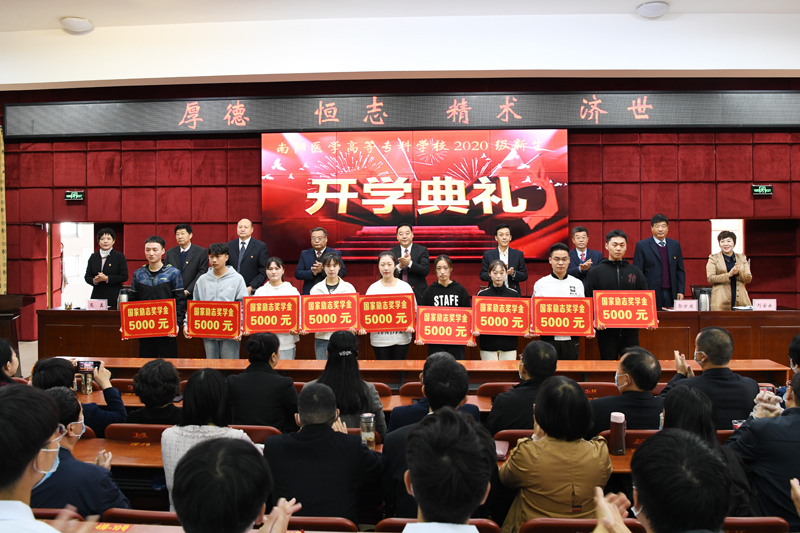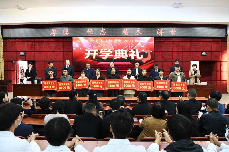 党委副书记逵应坤同志宣读了《万象城网页版,万象城(中国)关于表彰2018—2019学年各类奖学金获得者的决定》,校领导对荣获国家奖学金、国家励志奖学金的学生代表进行了现场颁奖。医学技术系教师樊冰、2020级口腔医学4班学生伊博宵分别作为教师和新生代表,作了热情洋溢的发言。