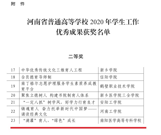 本网讯/护理系 闫珂)近日,河南省教育厅下发《关于表彰2020年普通高等学校学生工作优秀成果的决定》,我校由护理系申报的《“滴灌”育人, 绿色成长》项目获评2020年河南省普通高等学校学生工作优秀成果二等奖。