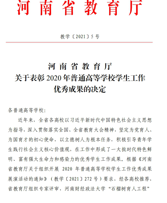 我校《“滴灌”育人, 绿色成长》项目荣获2020年河南省高等学校学生工作优秀成果