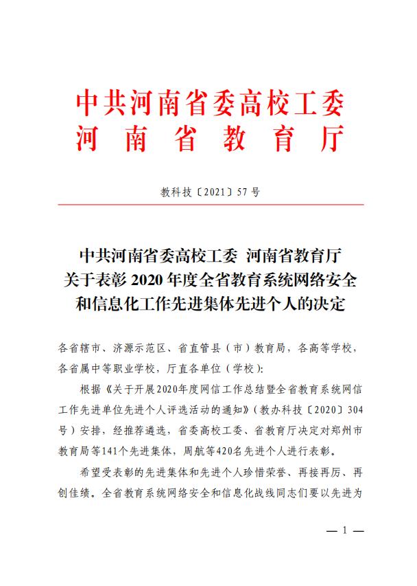 本网讯(/网络中心 张君阳)近日,河南省委高校工委和河南省教育厅联合下发了《关于表彰2020年度全省教育系统网络安全和信息化工作先进集体先进个人的决定》(教科技〔2021〕57号)。我校荣获“2020年度全省教育系统网络安全和信息化工作先进集体”荣誉称号,副校长、CIO(首席信息官)范真同志被评为“2020年度全省教育系统网络安全和信息化工作先进个人”。