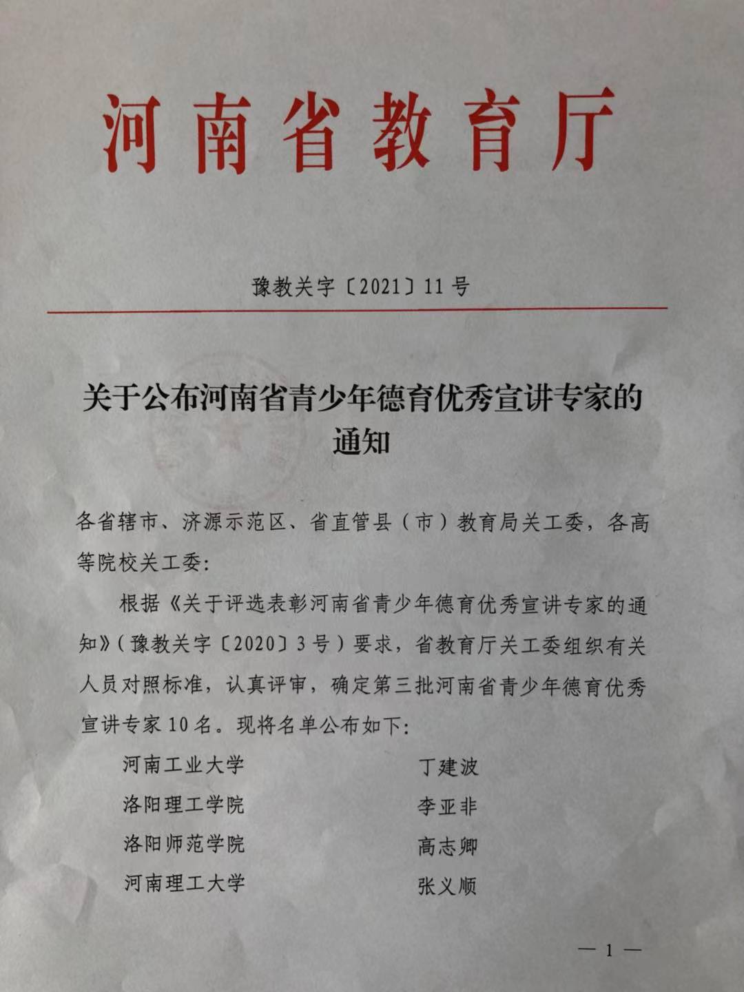 本网讯(文/离退处 朱迪)《河南省教育厅关于公布河南省青少年德育优秀宣讲专家的通知》(豫教关字[2021]11号)发布,南阳医专关心下一代工作委员会常务副主任张金虎被确定为第三批河南省青少年德育优秀宣讲专家。