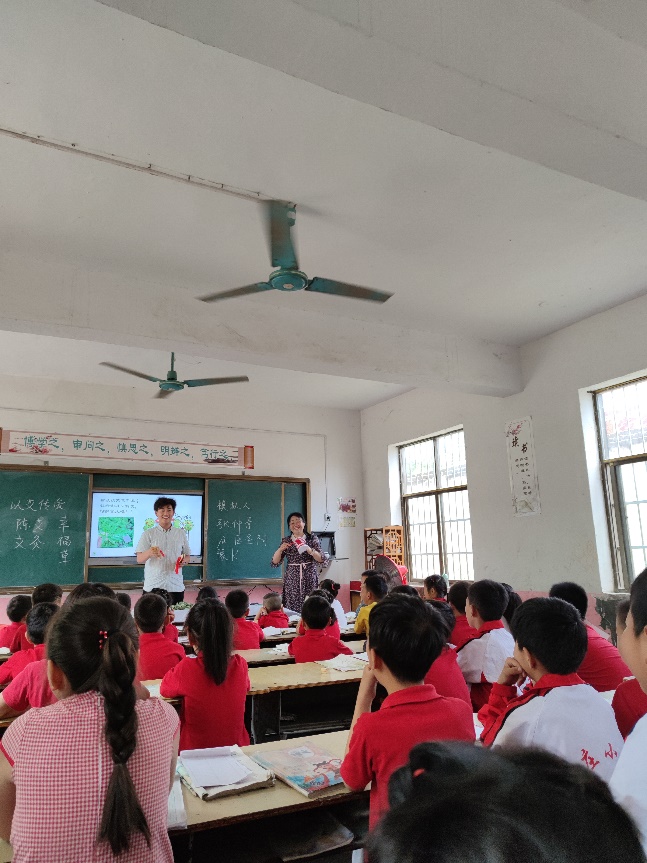 本次活动主题为“服务乡村振兴、医学教育扶智”,内容包括:其一,传授心肺复苏技能,规范刷牙方法,引导孩子们珍爱生命、健康成长;其二,普及天然药物知识,教育孩子们爱家乡、爱科学,鼓励他们勤奋学习;其三,唱红歌颂古诗,开展爱国爱党教育,传承中华优秀传统文化。逵应坤副书记、杜晓平教授多次深入陈庄小学,是孩子们的老朋友了,他们的再次到来,受到了师生们热烈的欢迎。李玲教授以“艾青青,爱传传”为题,循循善诱地从端午佳节的来历讲到南阳百姓的“幸福草”,让孩子们对熟知的艾草有了更科学更广泛的认识。机关一支部对党史学习教育知识点准备了宣教材料。活动中,孩子们愉快地领取了为他们准备的小书签,作业本、橡皮、笔及火腿肠等礼品。孩子们清澈的眼神、热情的应和、礼貌的答谢,给几位参义教大学生留下了深刻的印象,对他们而言是难得的体验和锻炼,一致表示要更加努力地学习,苦练本领,做基层百姓健康的“守门人”。