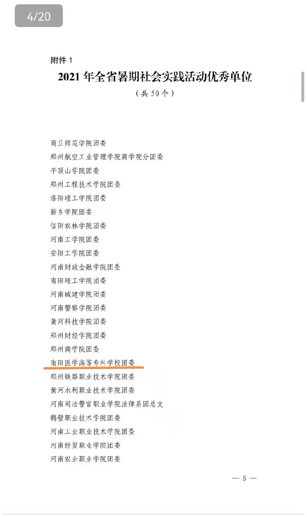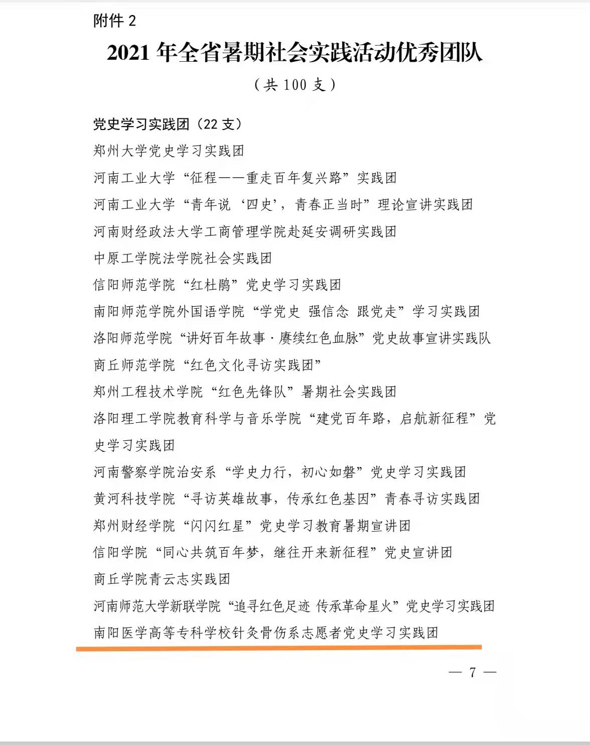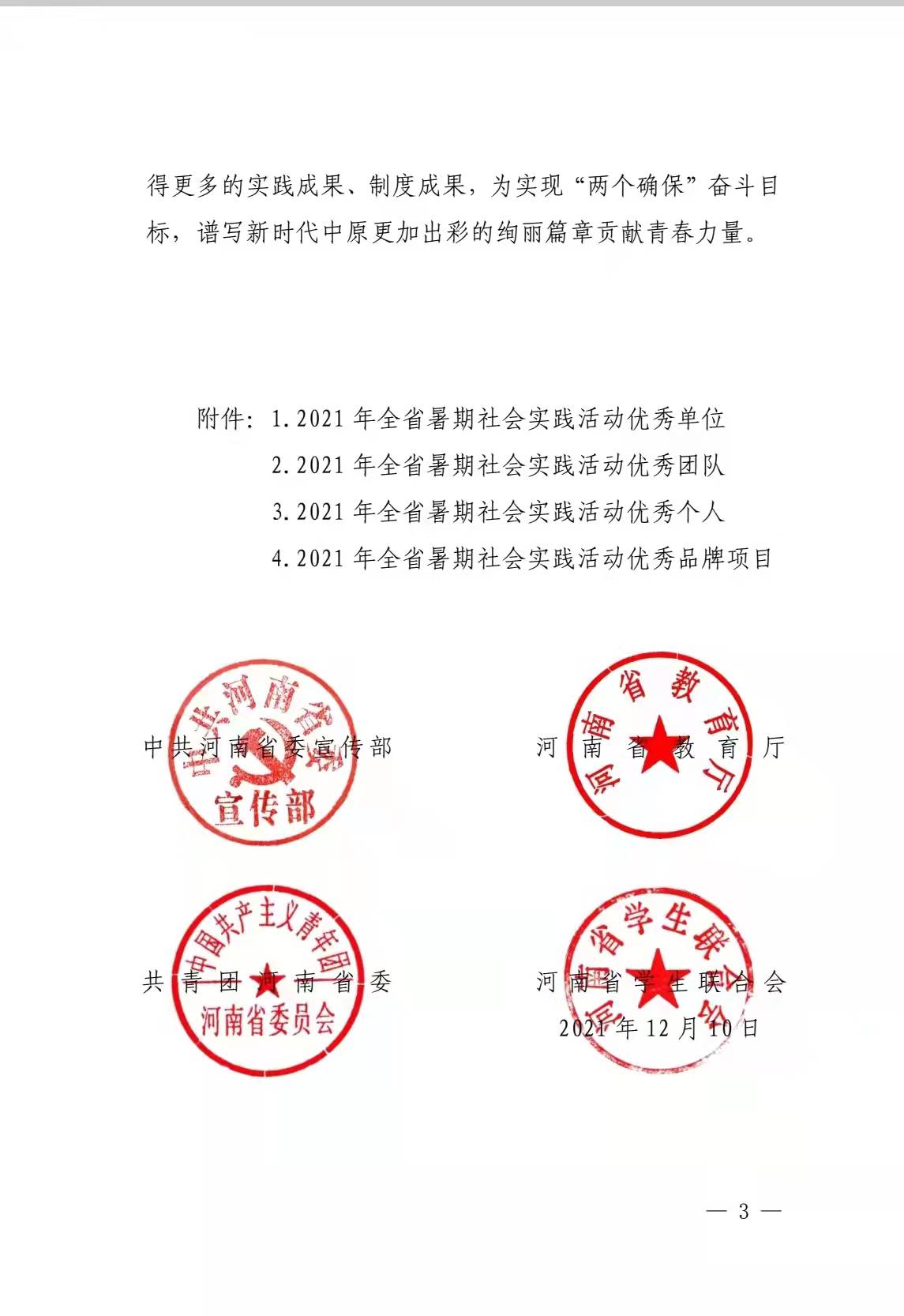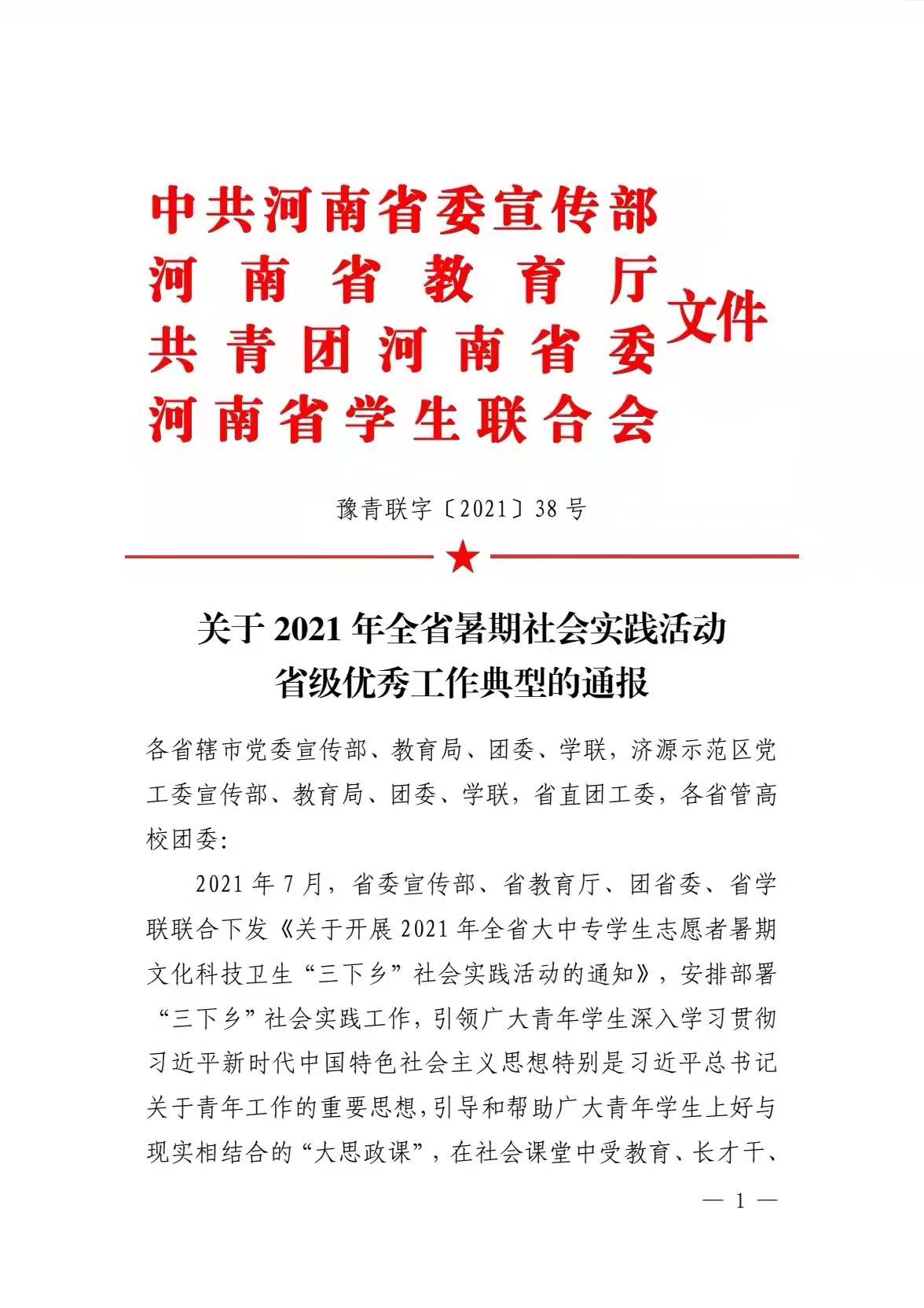 本网讯(文/校团委 古蝉蝉)近日,中共河南省委宣传部、河南省教育厅、共青团河南省委、河南省学生联合会联合发布《关于2021年全省暑期实践活动省级优秀工作典型的通报》,万象城网页版,万象城(中国)团委被评为“2021年全省暑期社会实践活动优秀单位”,万象城网页版,万象城(中国)针灸骨伤系志愿者党史学习实践团被评为“2021年全省暑期社会实践活动优秀实践团”。这是对我校社会实践工作的充分肯定与鼓励。