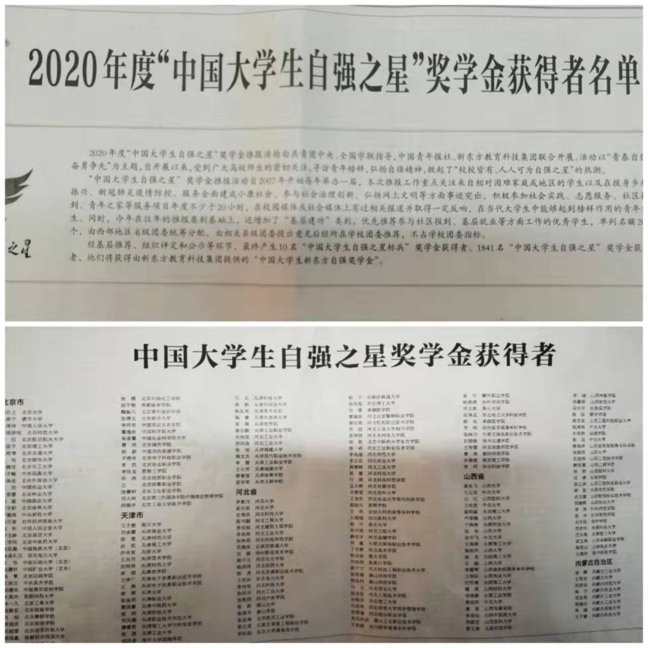 本次“中国大学生自强之星”奖学金推报工作由共青团中央、全国学联指导,中国青年报社、新东方教育科技集团联合开展。活动以“青春自强 奋勇争先”为主题,重点关注来自相对困难家庭或地区的学生以及在投身乡村振兴、新冠肺炎疫情防控、服务全面建成小康社会、参与社会治理创新、弘扬网上文明等方面事迹突出,在当代大学生中能够起到榜样作用的青年学生。本次推报工作采用“全国—省—校”三级体系,经学校团委、共青团河南省委两级推荐,全国组委会组织专家召开评审会,最终产生10名“中国大学生自强之星标兵”奖学金获得者、1841名“中国大学生自强之星”奖学金获得者。 河南省共有89名学生荣获“中国大学生自强之星”奖学金,我校程煜淇同学是其中光荣的一员。自2015到2021年,我校学生已连续6年获此殊荣。(编审/李峰松)