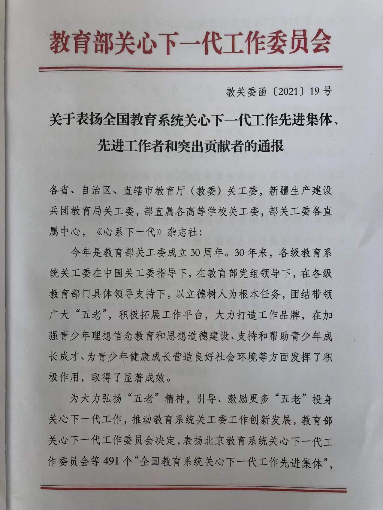 我校关工委将在今后工作中更加珍惜荣誉、再接再厉、再创佳绩。为“五老”开展工作营造良好的舆论和社会环境,在开启全面建设社会主义现代化国家新征程、向第二个百年奋斗目标进军中,深入贯彻落实习近平新时代中国特色社会主义思想和习近平总书记对关心下一代工作的重要指示,始终坚持服务青少年的正确方向,更加积极作为,为青少年的健康成长作出新的贡献。(编审 李峰松)