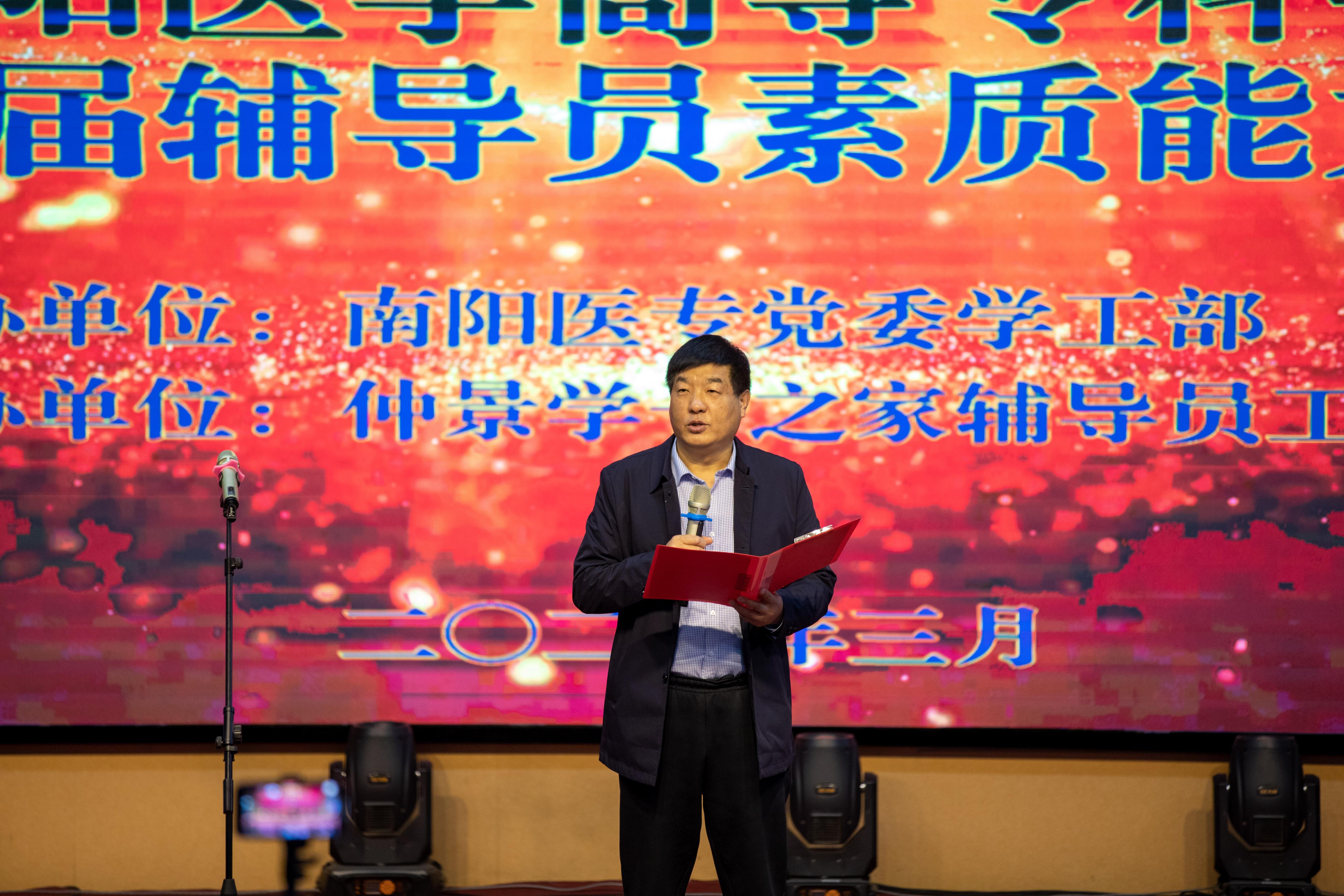 本网讯(文/学生处 皇甫乐观)3月11日,我校在仲景东区天景苑报告厅隆重举行第九届辅导员素质能力大赛决赛。校党委委员、副校长郭万周出席本次大赛并致辞,他对我校辅导员工作给予了充分肯定,我校辅导员队伍是一支能战斗、能吃苦、能奉献的队伍。组织部、宣传部、工会、团委、档案中心、公共教学部及学工部相关负责人担任评委,各系(院)领导,全体辅导员,学生代表现场观摩了大赛。