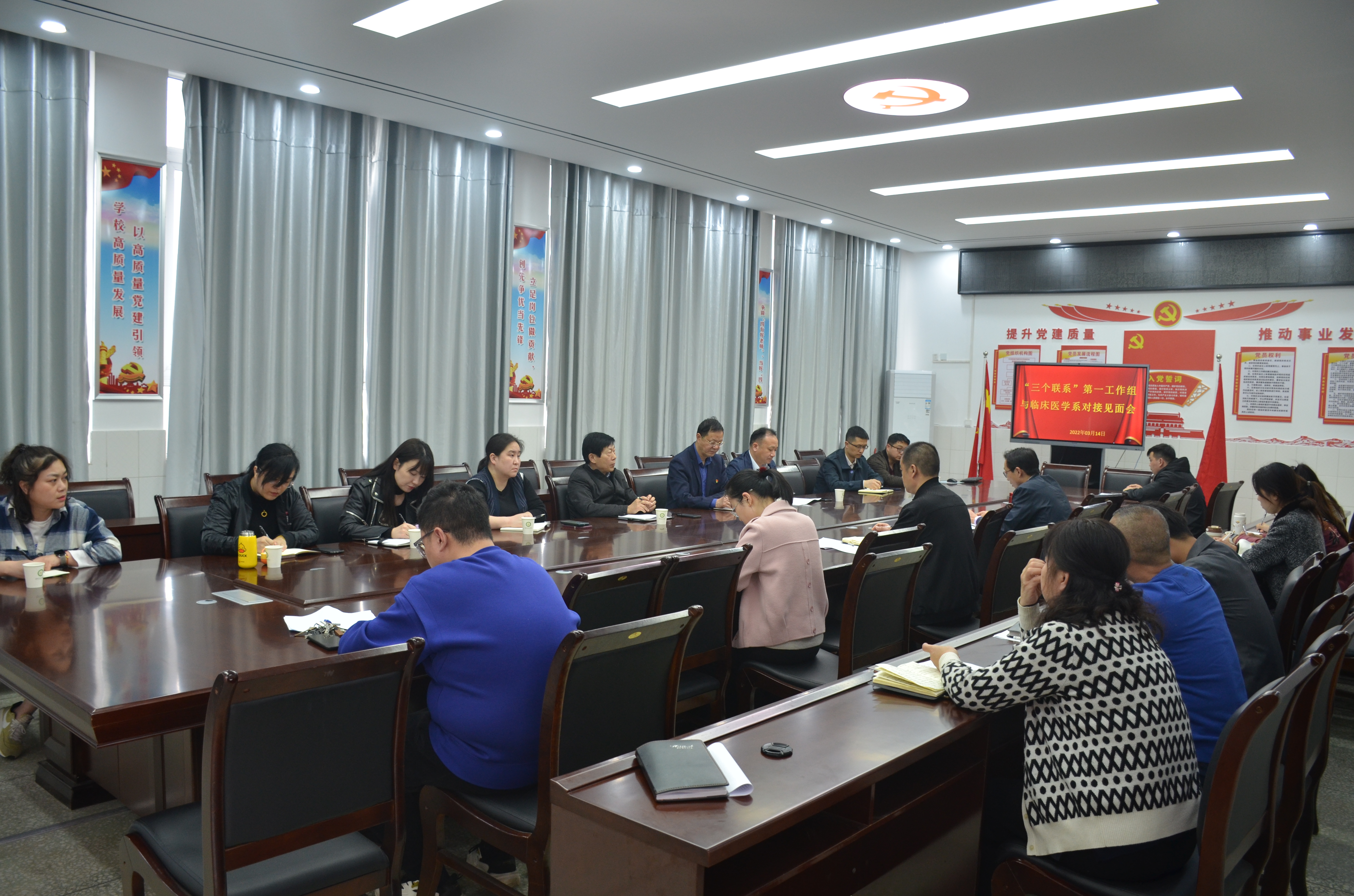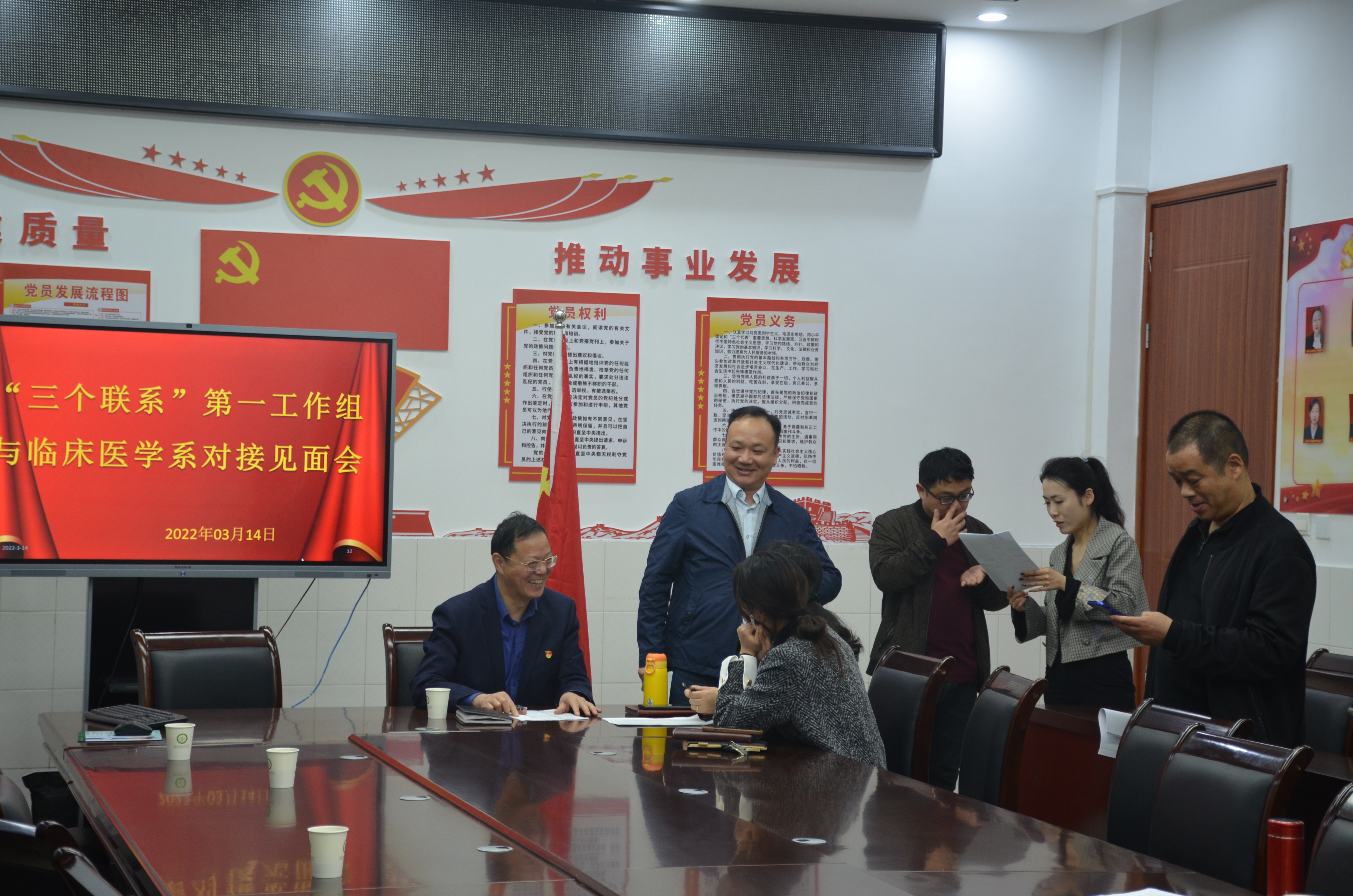 本网讯(文/临床系 王川)为深入贯彻落实《关于推进党史学习教育常态化 建立为师生办实事制度的实施意见》(宛医专党〔2021〕71号)文件要求,切实将“三个联系”工作制度落地落实, 3月14日下午,受第一工作组组长、校党委书记柳明伟委托,第一工作组副组长、校党政办主任江学法带领“三个联系”第一工作组成员与临床医学系在4号教学楼408会议室进行对接见面。第一工作组成员、临床医学系领导班子和全体辅导员参会。会议由系党总支书记秦玖刚主持。