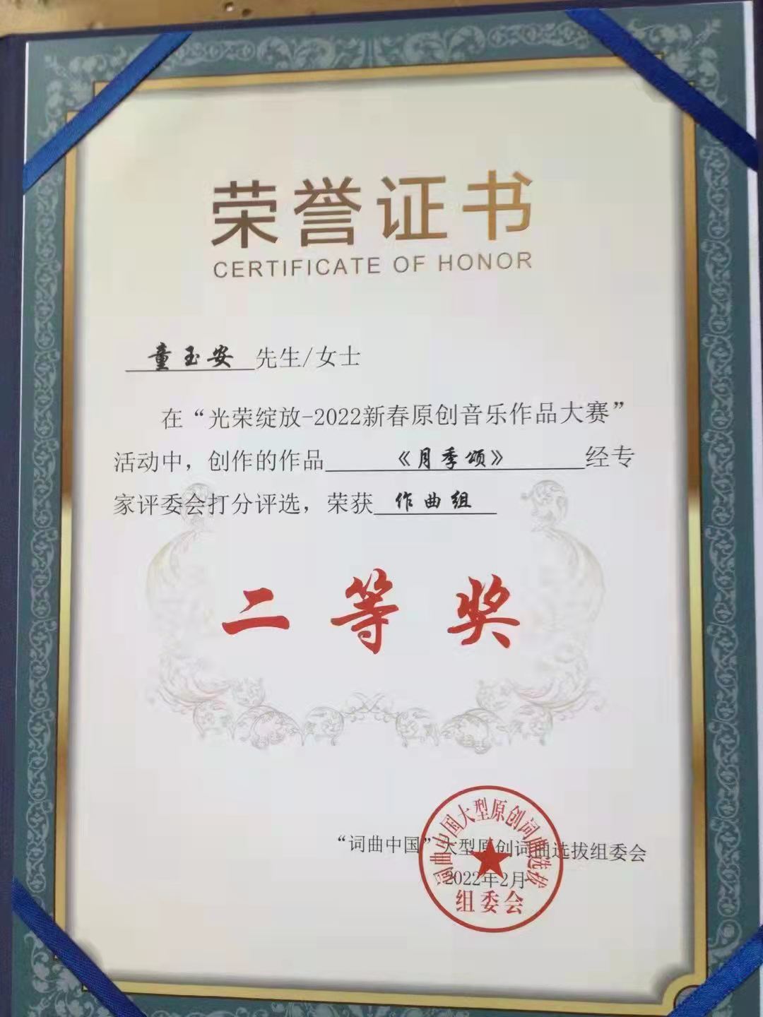 本网讯(文/离退处 艾静)据悉,“光荣绽放2022新春原创音乐作品大赛”近期落下帷幕,我校退休教师童玉安作曲的《月季颂》、郑胜利作词的《月季情》,分别荣获二等奖。