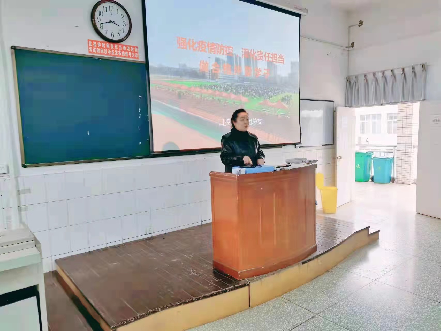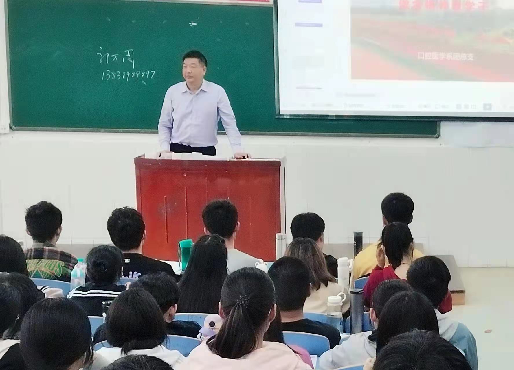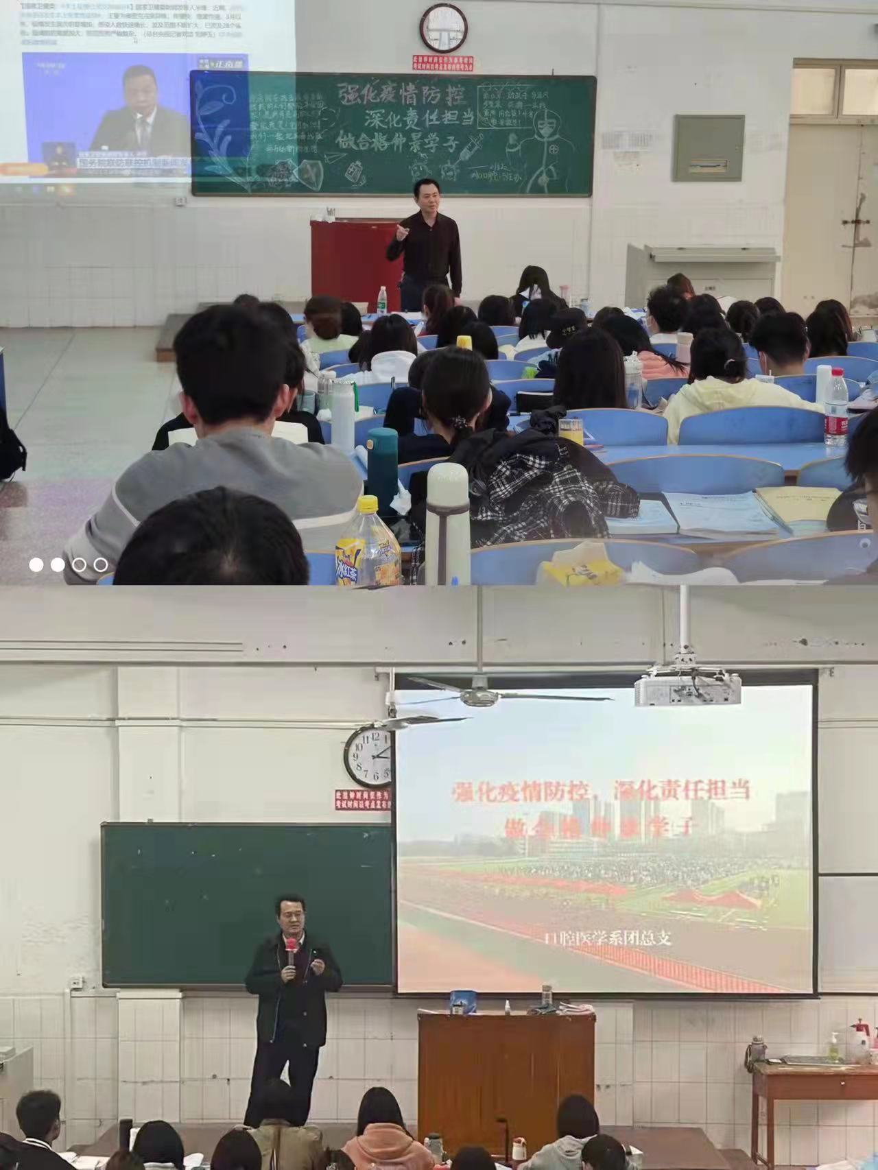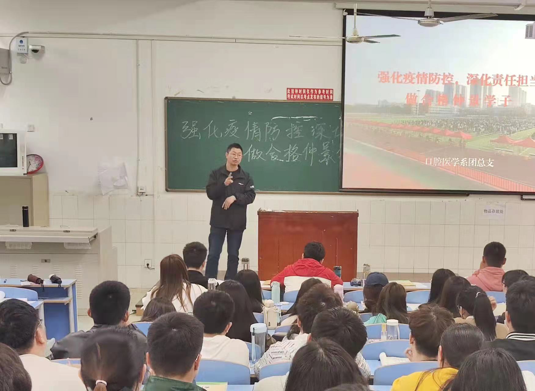本网讯(文/口腔医学系 王金金)当前疫情势态严峻,为确保师生身体健康和生命安全,织密扎牢学校疫情防控“安全网”,3月16日下午,口腔医学系召开“强化疫情防控,深化责任担当,做合格仲景学子”的主题班会。“三个联系”第六工作组组长、副校长郭万周、口腔医学系党总支书记余飞海与全体师生同上“疫情防控课”。