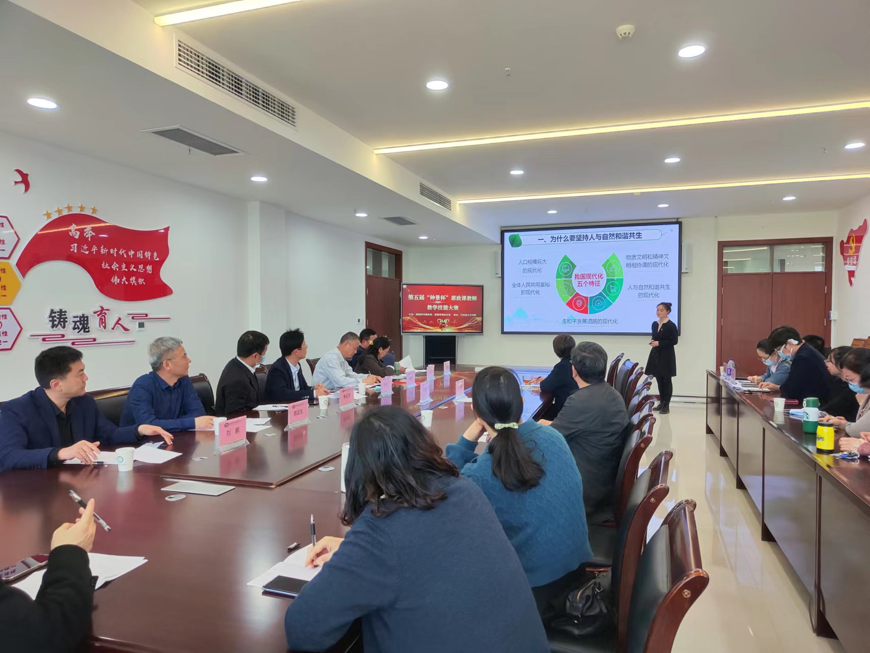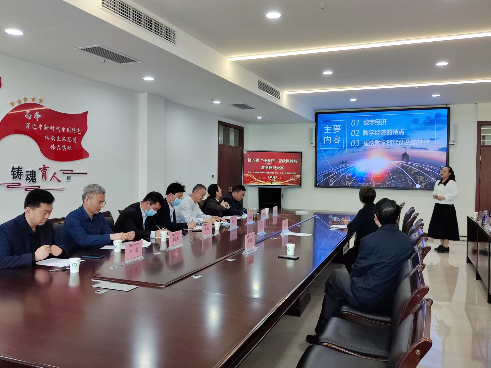 本网讯(文/马克思主义学院 卢孟)为深入学习贯彻习近平总书记在学校思想政治理论课教师座谈会上的重要讲话精神和“大思政课”重要指示精神,按照《关于开展全省学校思想政治理论课教学技能“大练兵、大比武、大展示”活动的实施意见》(豫高发〔2021〕141号)的要求,2022年4月20日下午,由教务处、质量管理办公室主办,马克思主义学院承办的南阳医专第五届“仲景杯”思政课教师教学技能大赛决赛在仲景文化中心隆重举行,校党委副书记逵应坤、教务处处长、质量管理办公室主任、党委组织部部长、宣传部部长等领导出席。特聘请南阳师范学院马克思主义学院院长靳安广教授、南阳理工学院马克思主义学院院长姜金林教授等专家担任大赛评委。全校思政课专兼职教师全员参加观摩学习。