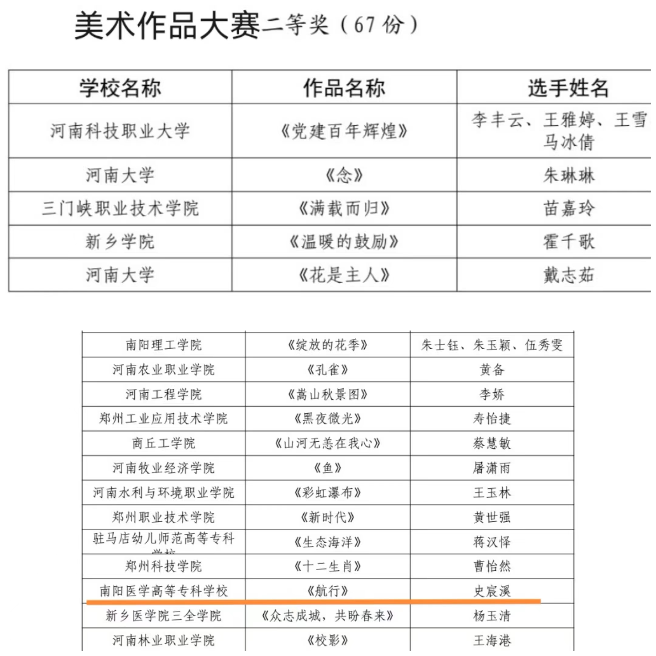 河南省第十七届大学生网上科技文化艺术节南阳医专获奖名单