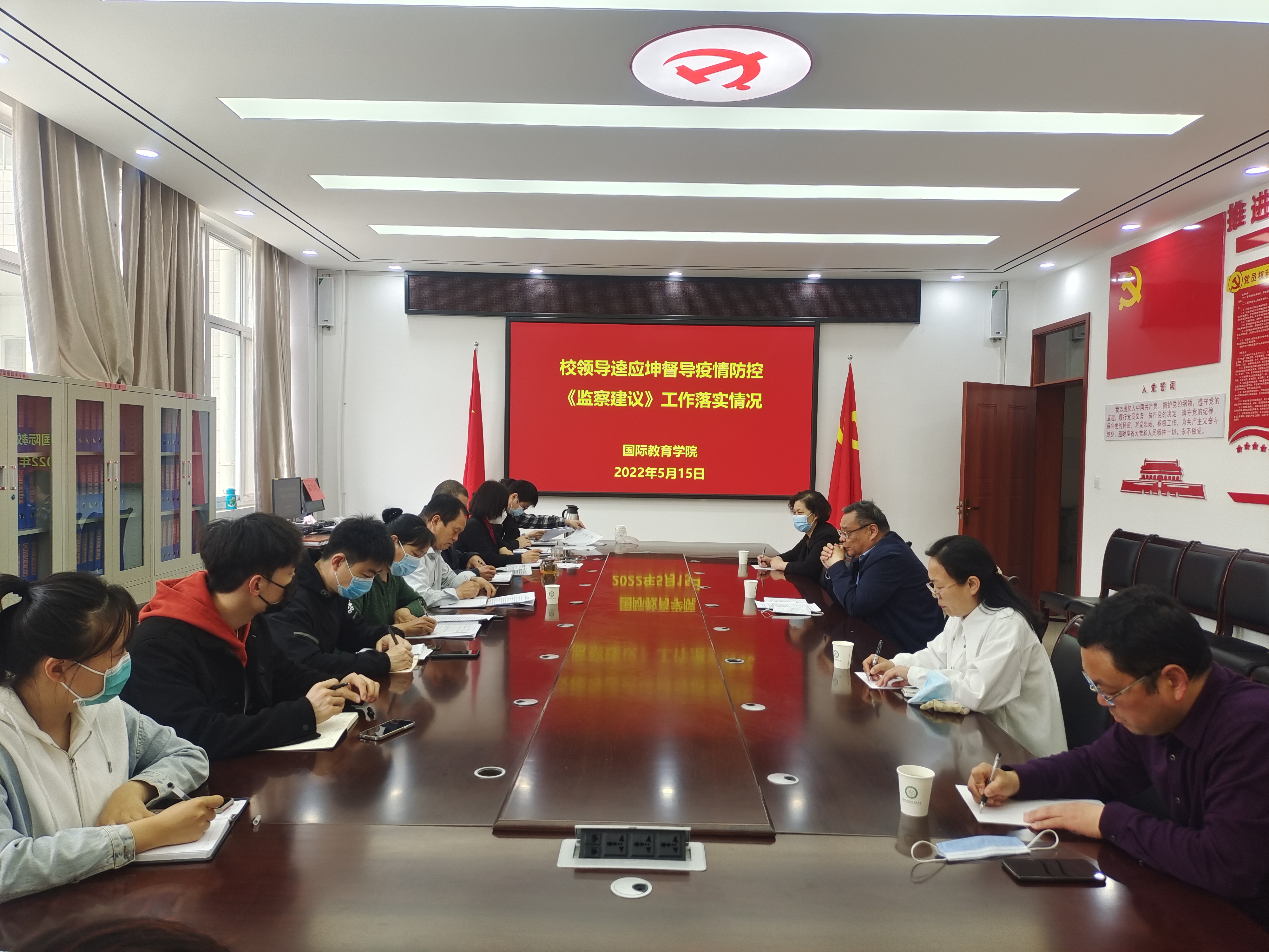 本网讯(文/国教院 李斐)5月15日上午,校领导逵应坤和“三个联系”第三工作组有关负责同志深入国际教育学院召开会议,督导疫情防控《监察建议》工作落实情况,学院全体教职工参会。会议由外事国教党总支书记卢朝彬主持。