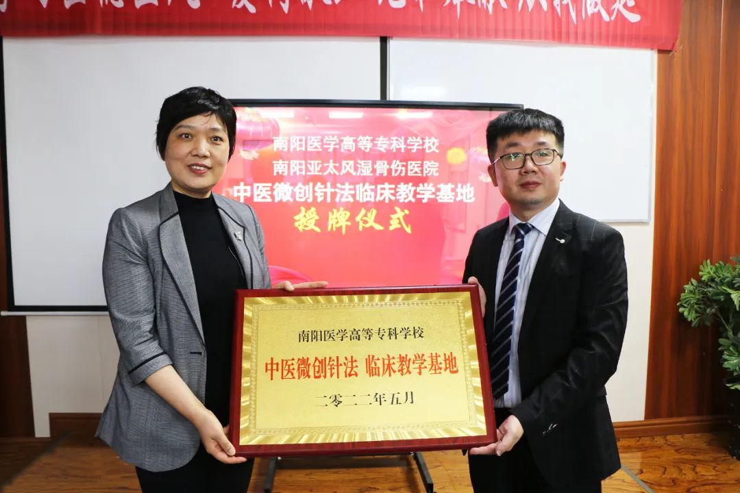 本网讯(文/针灸骨伤系 李明哲 逵建澍 教务处 刘荣志)为进一步探索建立“现代学徒制”与“传统师带徒”相结合的办学模式,精确定位专业人才培养目标,培育专业特色,2022年5月20日,校党委委员、副校长范真带领教务处、针灸骨伤系、中医系相关人员深入南阳亚太风湿骨伤医院开展调研指导,为国家级“中医微创应用技术协同创新中心”、河南省职业院校中医骨伤专业“技艺技能传承创新平台”和“中医微创针法临床教学基地”揭牌。