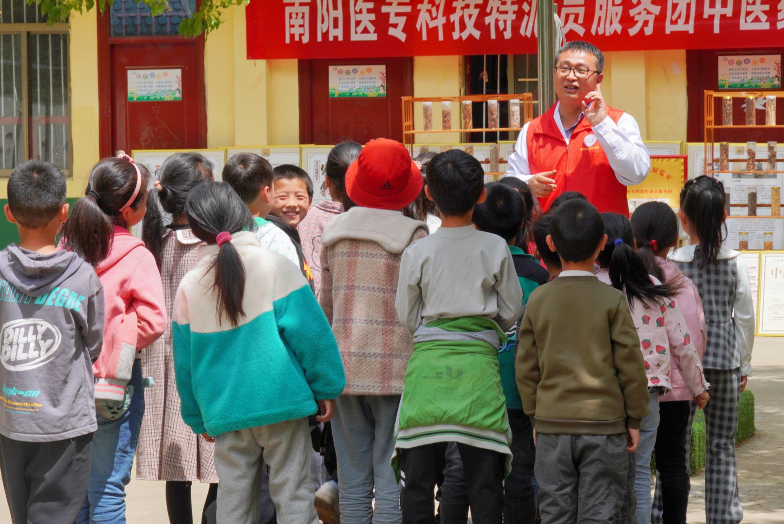送科普。乡村振兴人才扶智先行。抓好青少年中医药文化启蒙教育的有效手段,也是服务乡村振兴、推动医学教育扶智的重要方式。南阳医专科技成员、针灸骨伤系党总支副书记李明哲为孩子们讲解健康知识、现场传授基础推拿保健手法,激发了孩子们对中医中药文化的浓厚兴趣,受到了孩子们的喜爱。