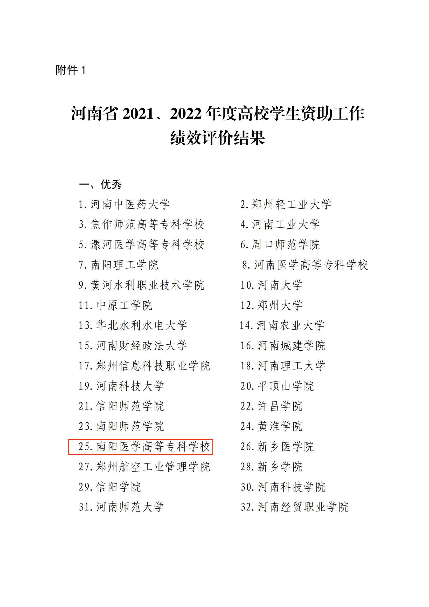 根据《河南省教育厅 国家开发银行河南省分行关于对2021、2022年度全省高校和省属中职学校学生资助工作进行绩效评价的通知》(教资助〔2023〕115号)要求,本次绩效评价工作从3月1日开始,至4月28日结束,分为学校自评、专家组复评和实地复核三个阶段,考核内容涵盖了基础保障、日常管理、管理绩效、附加评价等方面的49个指标体系,省教育厅会同国家开发银行河南省分行成立十个高校学生资助工作专家组,对全省155所高校2021、2022年度学生资助工作进行了全面绩效评价,分别对各高校提交的自评材料进行了集中复评、实地复核。本次共评选出优秀37所,良好68所,合格35所,不合格15所,我校荣获优秀等次,彰显了了我校高质量资助育人成果。