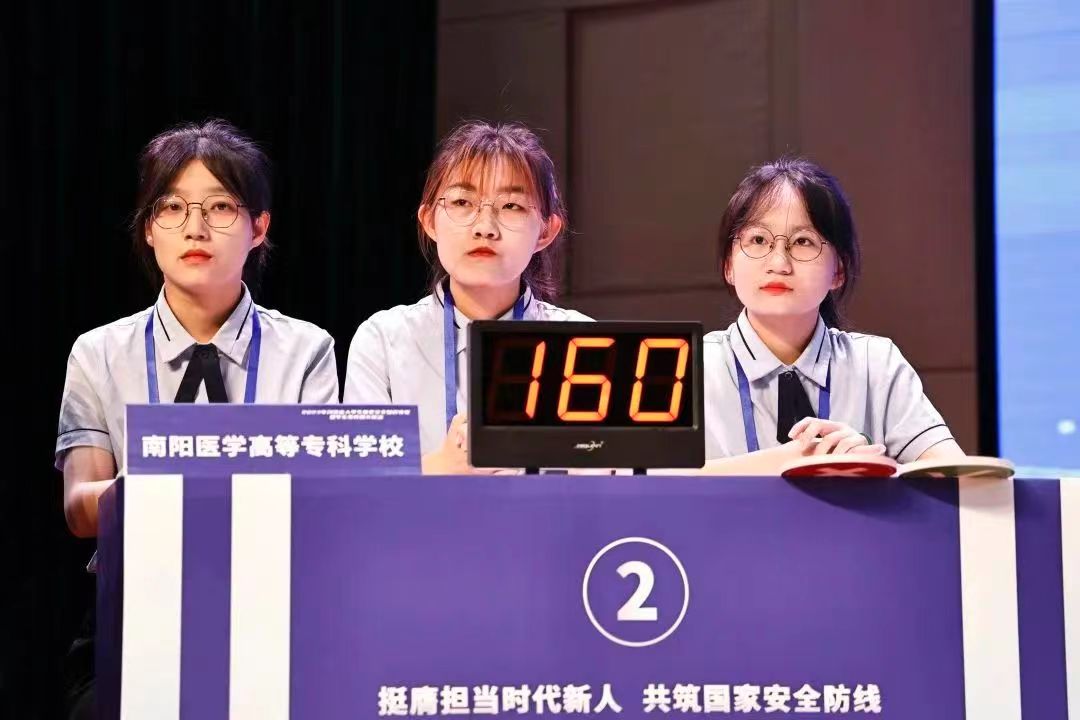 在省级现场决赛中,我校“仲景学子”代表队与全省本专科院校20支参赛队伍展开激烈角逐。在答题环节,我校选手凭借扎实的基本功表现优异;在素养展示环节,我校展示的情景剧贴合社会热点,将维护国家安全融入其中,贴近现实生活,受到评委与观众们的喜爱。