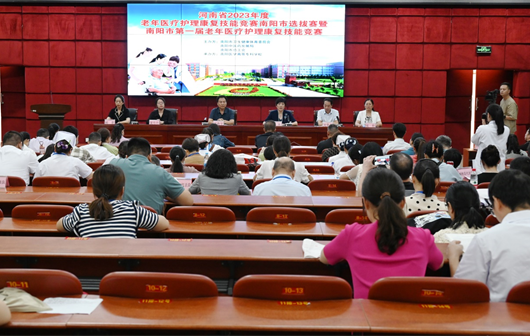 本网讯(文/康复医学系 苏芳静)由南阳市卫生健康体育委员会、南阳中医药发展局和南阳市总工会主办,万象城网页版,万象城(中国)承办的河南省2023年度老年医疗护理康复技能竞赛南阳市选拔赛暨南阳市第一届老年医疗护理康复技能竞赛在我校举行。南阳市各县市区和市直医院共23个代表队参赛。8月31日上午10点,在我校图书馆五楼举行了开幕式,南阳市卫健体委党组成员副主任郭晓华,市卫健体委老龄健康科科长顾蕾,市中医药发展局科教文化科科长冀丹丹,南阳医专副校长范真、刘荣志,康复医学系主任张欣出席了本次开幕式。开幕式由刘荣志主持。