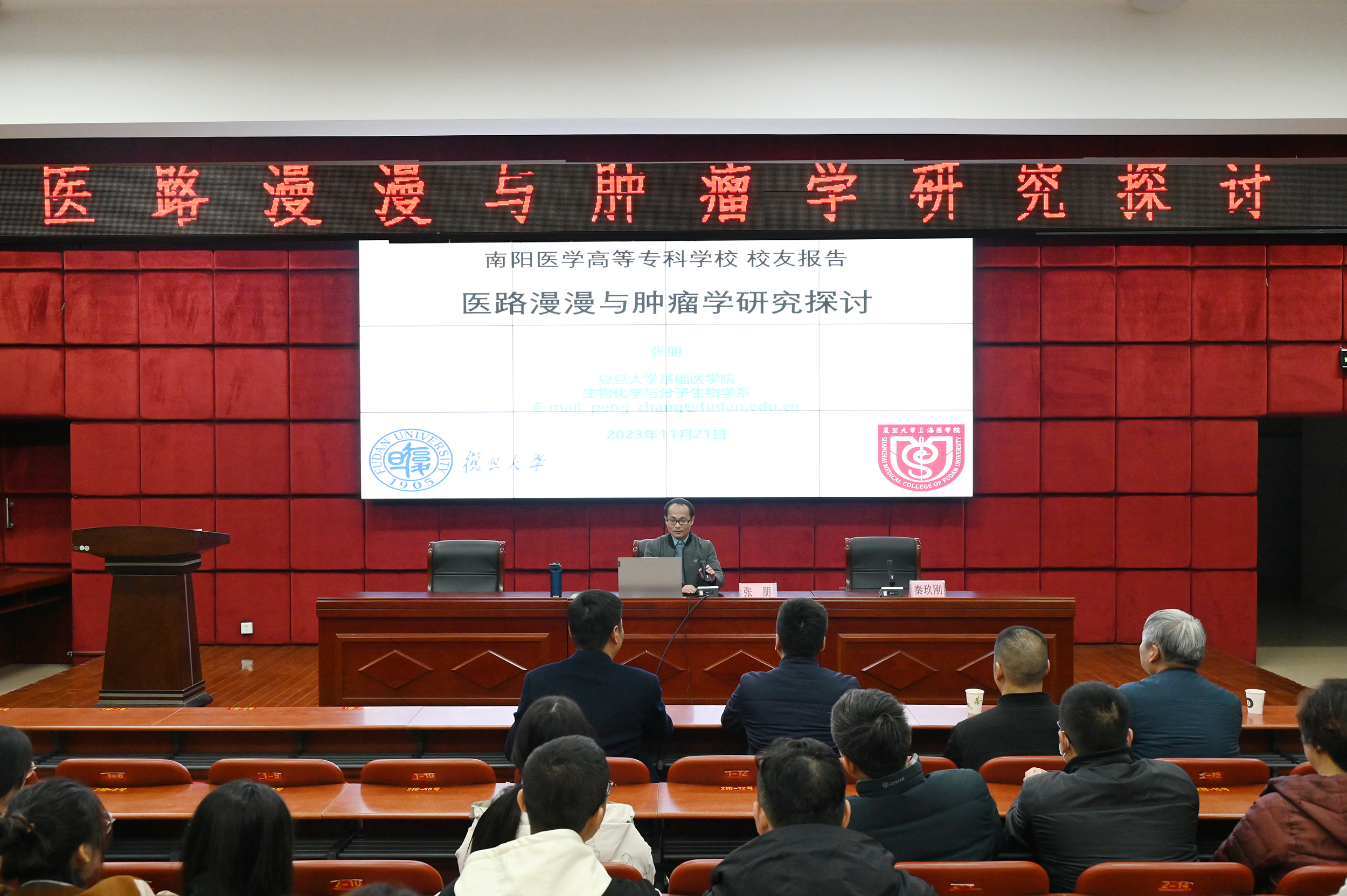 本网讯(文/就业创业处 杜婧)浓浓母校情,依依校友心。11月20日晚,医路漫漫与肿瘤学研究探讨专题报告会在我校图书馆五楼报告厅举办,报告会由我校杰出校友、上海复旦大学基础医学院生物化学与分子生物学系副研究员、美国威斯康星医学院博士后张朋讲授,校党委委员、副校长秦玖刚出席并主持报告会,临床医学系、基础医学部40余名教师及200余名在校学生参会。报告会采用线上线下相结合的模式同步进行。