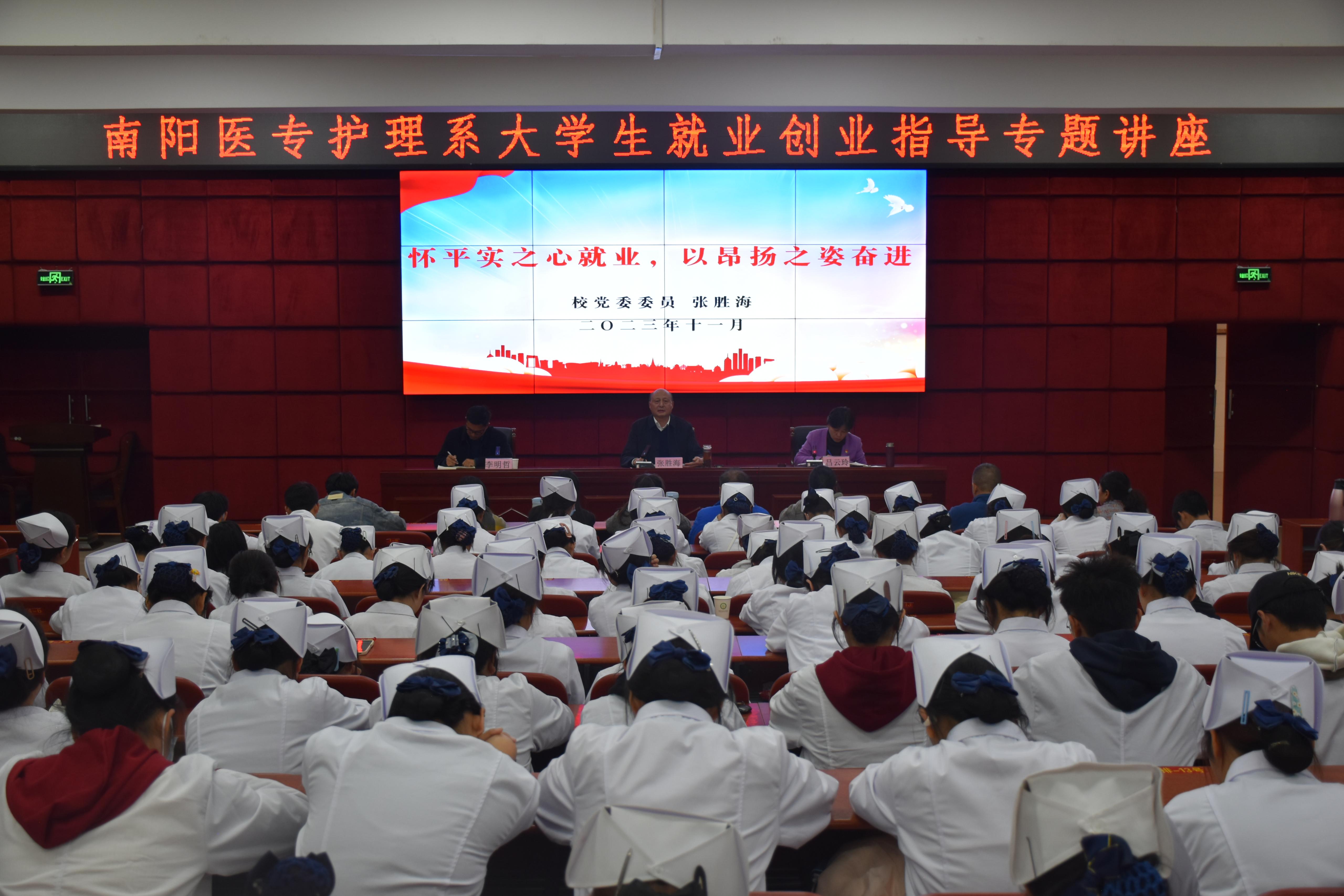 本网讯(文/护理系 何红丽)为教育和引导广大学生正确认识就业形势,提高就业应对能力,11月23日下午,校党委委员张胜海在仲景西区图书馆5楼报告厅为护理系学生作题为《怀平实之心就业,以昂扬之姿奋进》的专题讲座,护理系行管干部和全体辅导员参加,护理系主任吕云玲主持讲座。