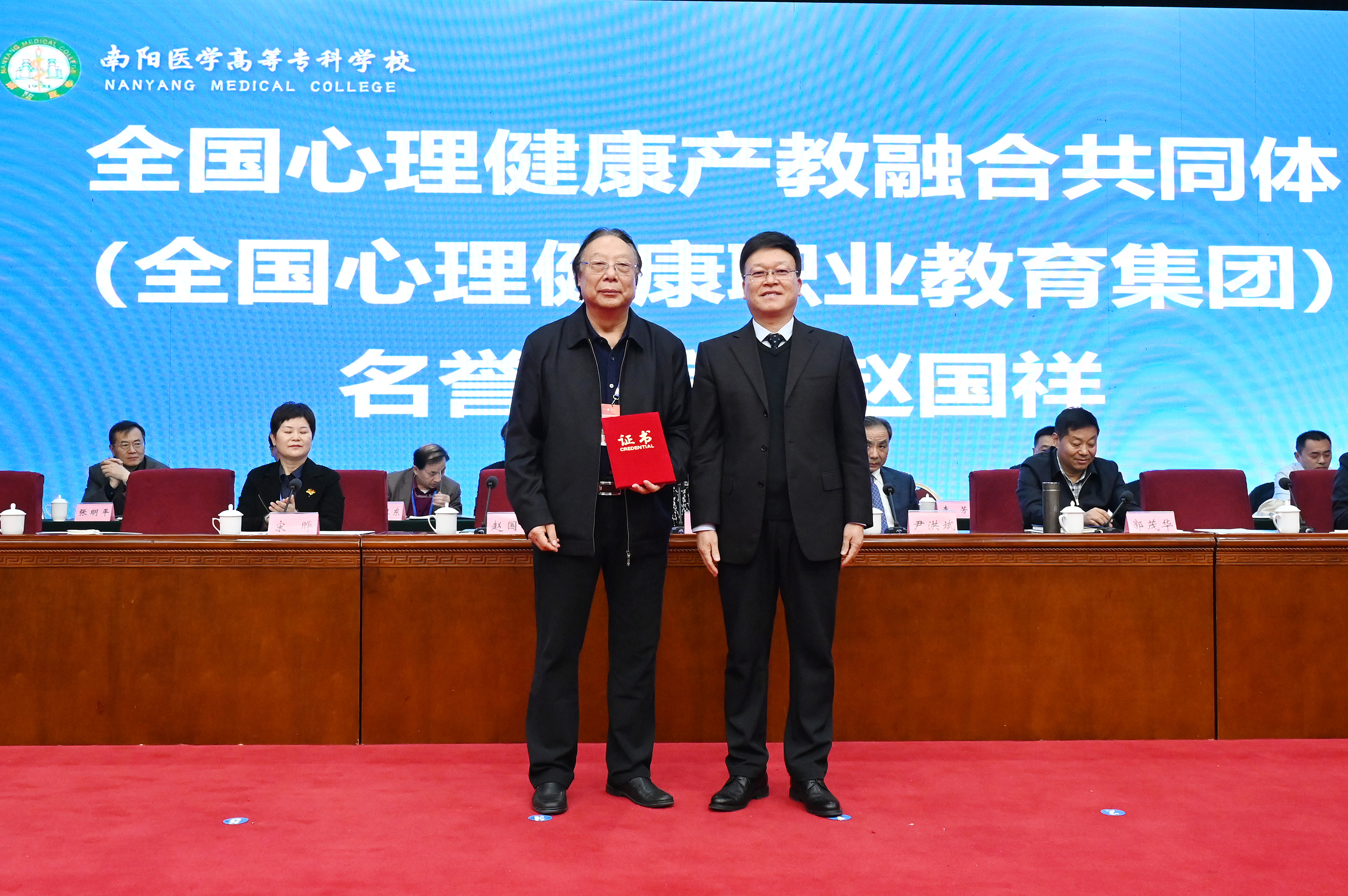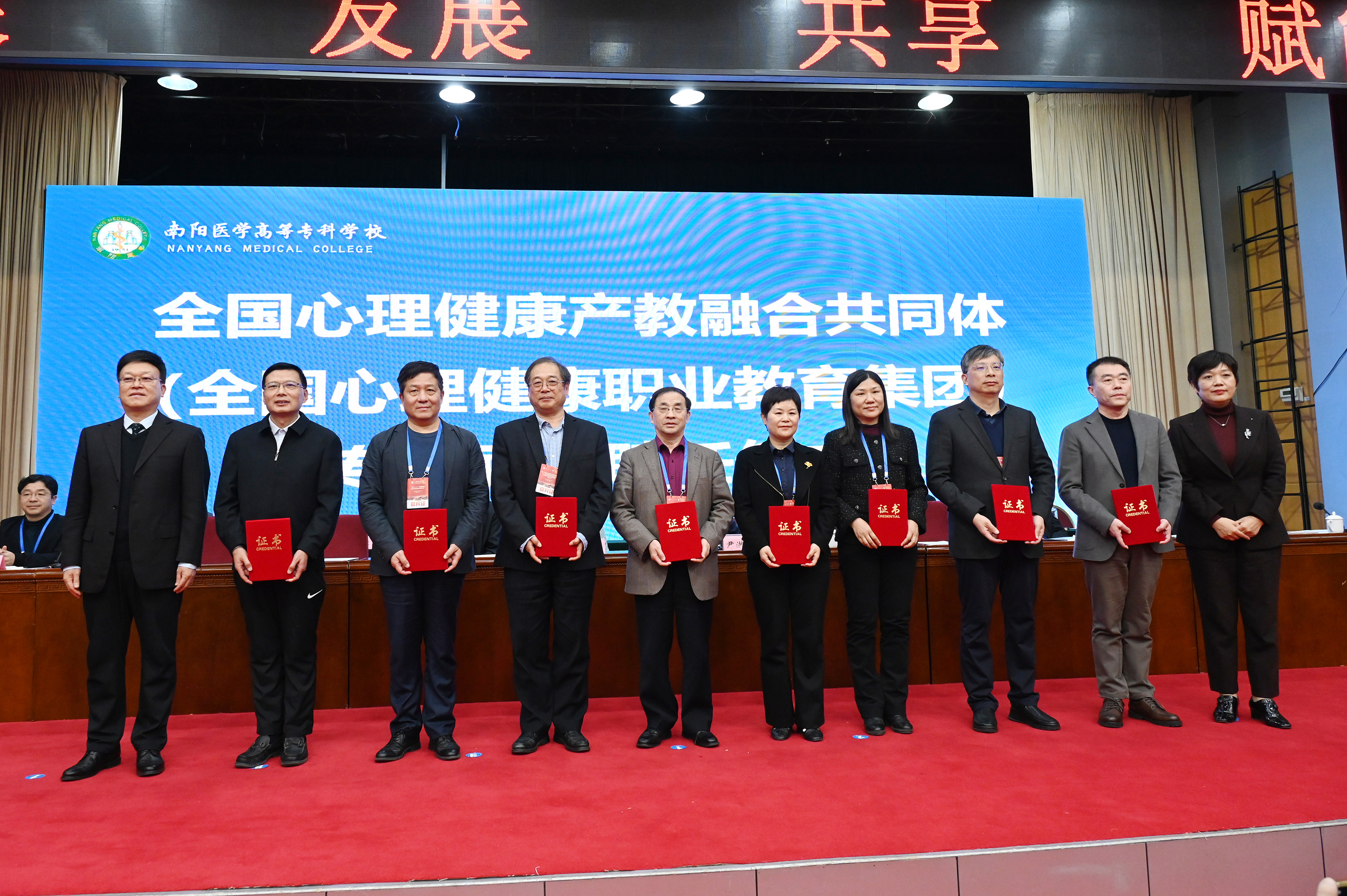 姜雯、尹洪斌、赵国祥、郭茂华、宋晔、柳明伟、范真及与会嘉宾代表宣布全国心理健康产教融合共同体(全国心理健康职业教育集团)成立。河南师范大学副校长宋晔对共同体成立予以祝贺,表示将与南阳医专等兄弟院校一起致力于全国心理健康产教融合共同体建设。柳明伟向全国心理健康产教融合共同体(全国心理健康职业教育集团)名誉主席赵国祥教授颁发聘书,柳明伟、范真共同为国家中医药管理局中医心理学重点学科与重点专科带头人、中国中医科学院首席研究员汪卫东,中国心理学会副监事长赵俊峰,教育部心理学类教学指导委员会副主任委员、北京师范大学心理学部教授、博士生导师林丹华等全国心理健康产教融合共同体专家顾问颁发聘书。会上宣读了《职业教育心理健康公益活动倡议书》,发布了全国心理健康产教融合共同体理事会名单,河南师范大学、江西师范大学担任名誉理事长单位,万象城网页版,万象城(中国)、临沂职业学院、山东菏泽信息工程学校担任理事长单位,河南大河医疗集团担任监事长单位。