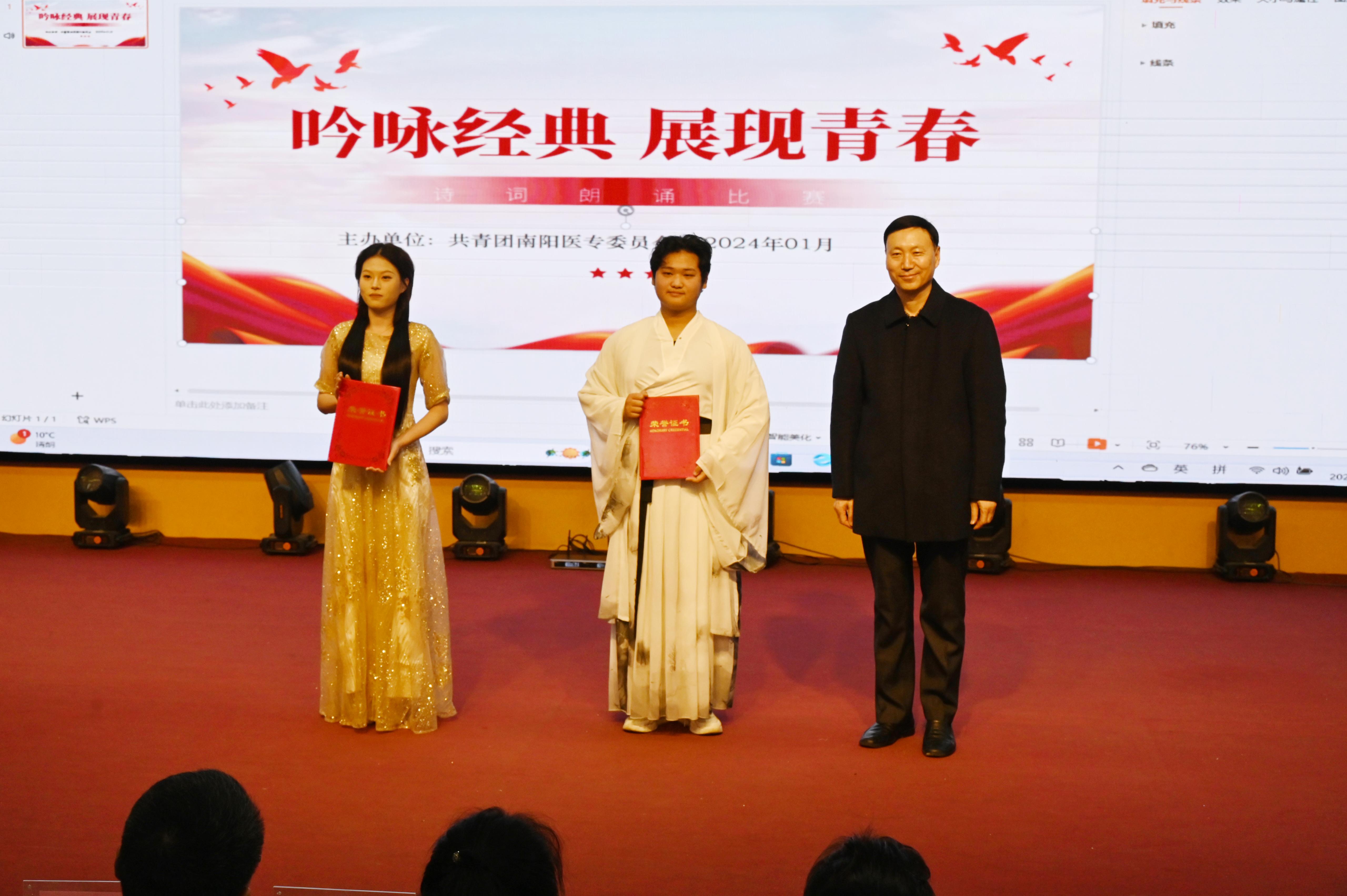 本网讯(文/校团委 马黎莉)1月3日下午,南阳医专“吟咏经典 展现青春”诗词朗诵大赛在仲景东区礼堂二楼报告厅隆重举行。校党委委员、工会主席杜晓平、宣传部部长李红普、工会副主席库建伟、就业创业处处长刘鹏、团委刘怀东及各系(院)党总支书记出席了本次活动。