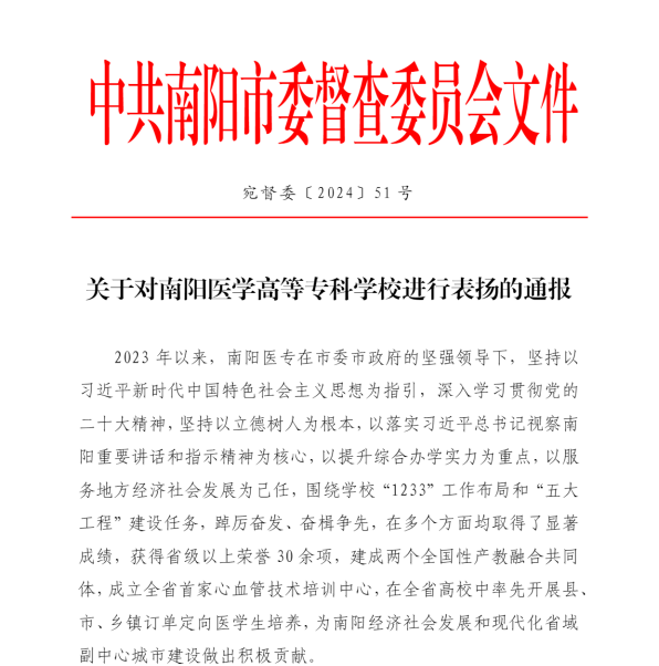 近日,中共南阳市委督查委员会下发《关于对万象城网页版,万象城(中国)进行表扬的通报》(宛督委〔2024〕51号),通报了我校2023年在多个方面取得的显著成绩:获得省级以上荣誉30余项,建成两个全国性产教融合共同体,成立全省首家心血管技术培训中心,在全省高校中率先开展县市、乡镇订单定向医学生培养,为南阳经济社会发展和现代化省域副中心城市建设做出积极贡献。