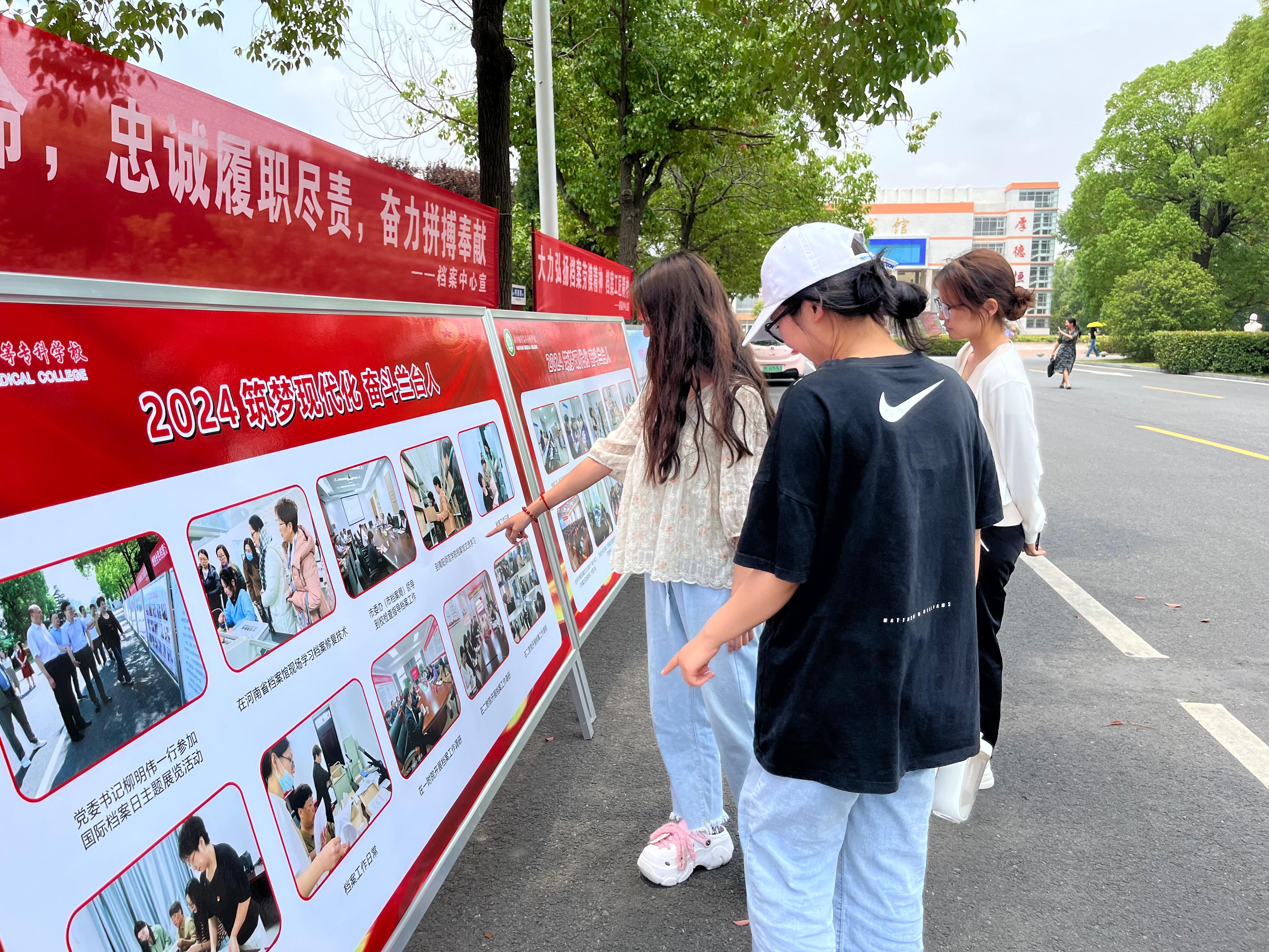 一是举办了“筑梦现代化 奋斗兰台人”主题展览。在悬挂宣传标语、张贴宣传海报、电子屏滚动播放《档案法实施条例》及档案知识的基础上,67日上午,在仲景西区1号办公楼前举行了“筑梦现代化 奋斗兰台人”主题展览,用10个版面全面展示了习近平总书记关于档案工作的重要批示指示精神、档案法律法规、依法治档案例、奋斗兰台人等内容。各部门(单位)领导和专兼职档案员参加了活动。党委副书记、校长范真,党委委员、副校长秦玖刚亲临活动现场参观指导,并与大家亲切交流,把校党委对档案工作的重视、对档案工作人员的关怀落到了实处,使广大档案工作人员提振了干事创业精气神,激发了担当作为的新活力。