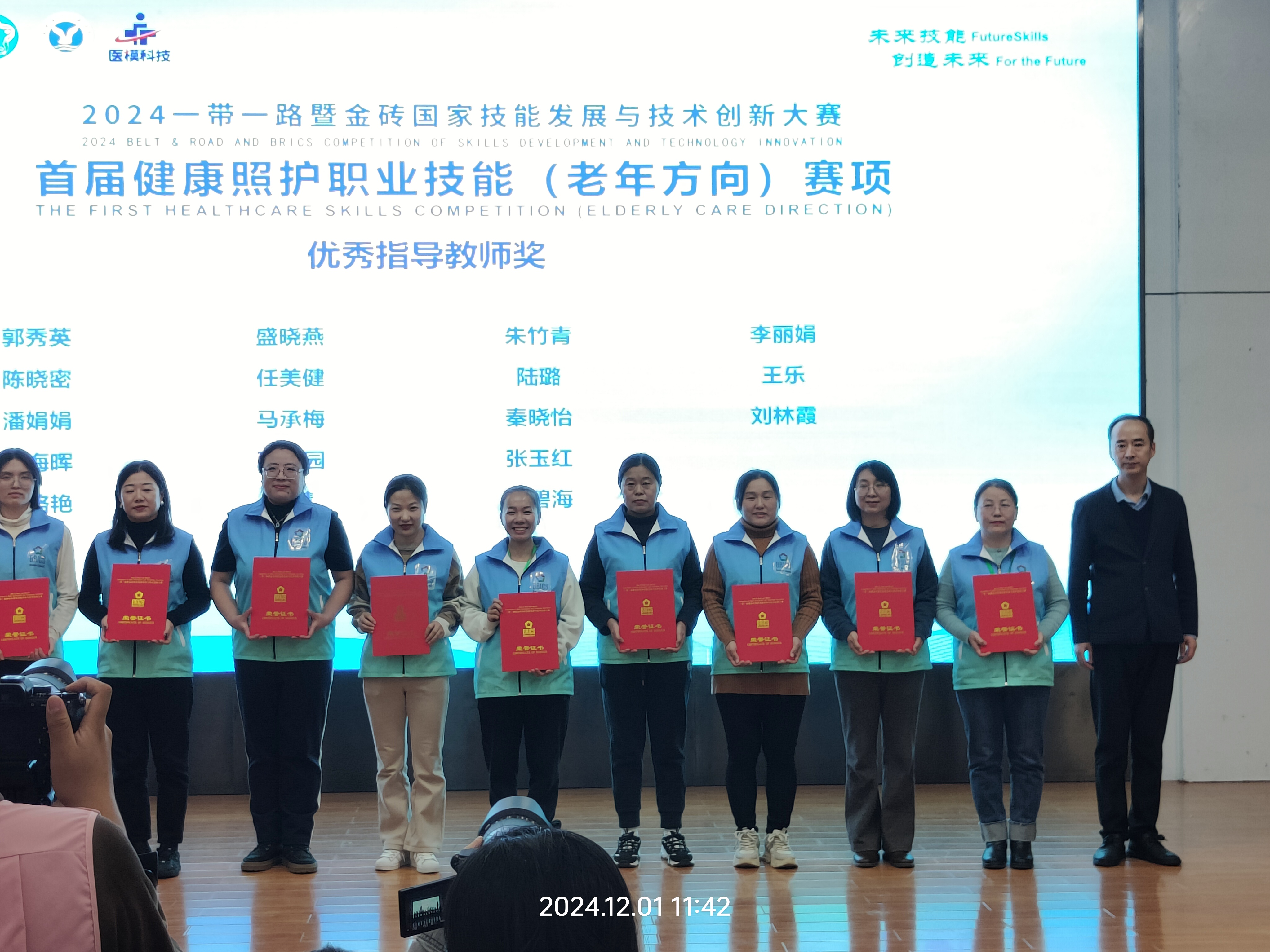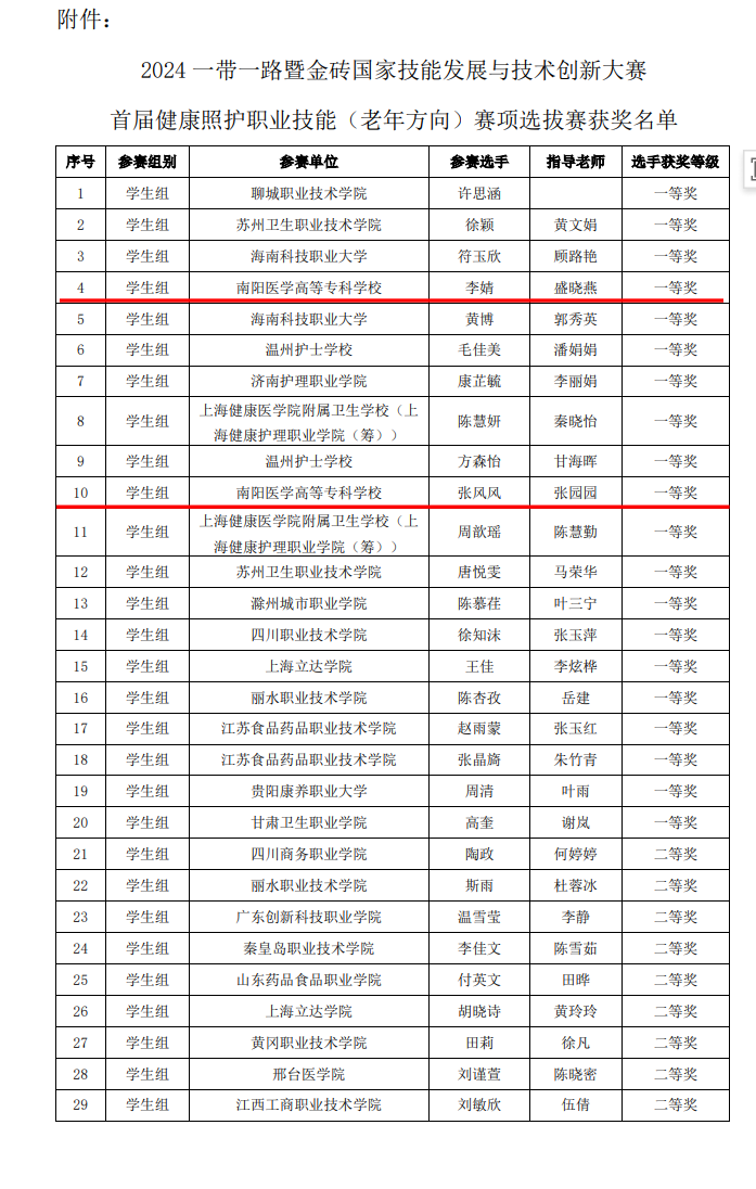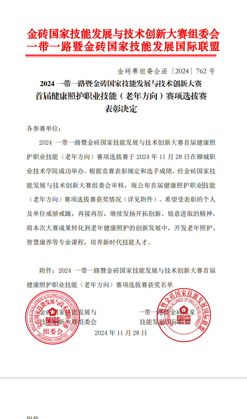 本网讯(文/护理系 何红丽)1128日至30日,2024年“一带一路”暨金砖国家技能发展与技术创新大赛之首届健康照护职业技能(老年方向)竞赛全国总决赛在聊城职业技术学院举行。在全国总决赛中,我校护理系李婧、张风风分别以第7名和第10名的成绩荣获“国内总决赛二等奖(银牌)”,教师盛晓燕、张园园荣获“优秀指导教师奖”,我校获得“优秀组织奖”。