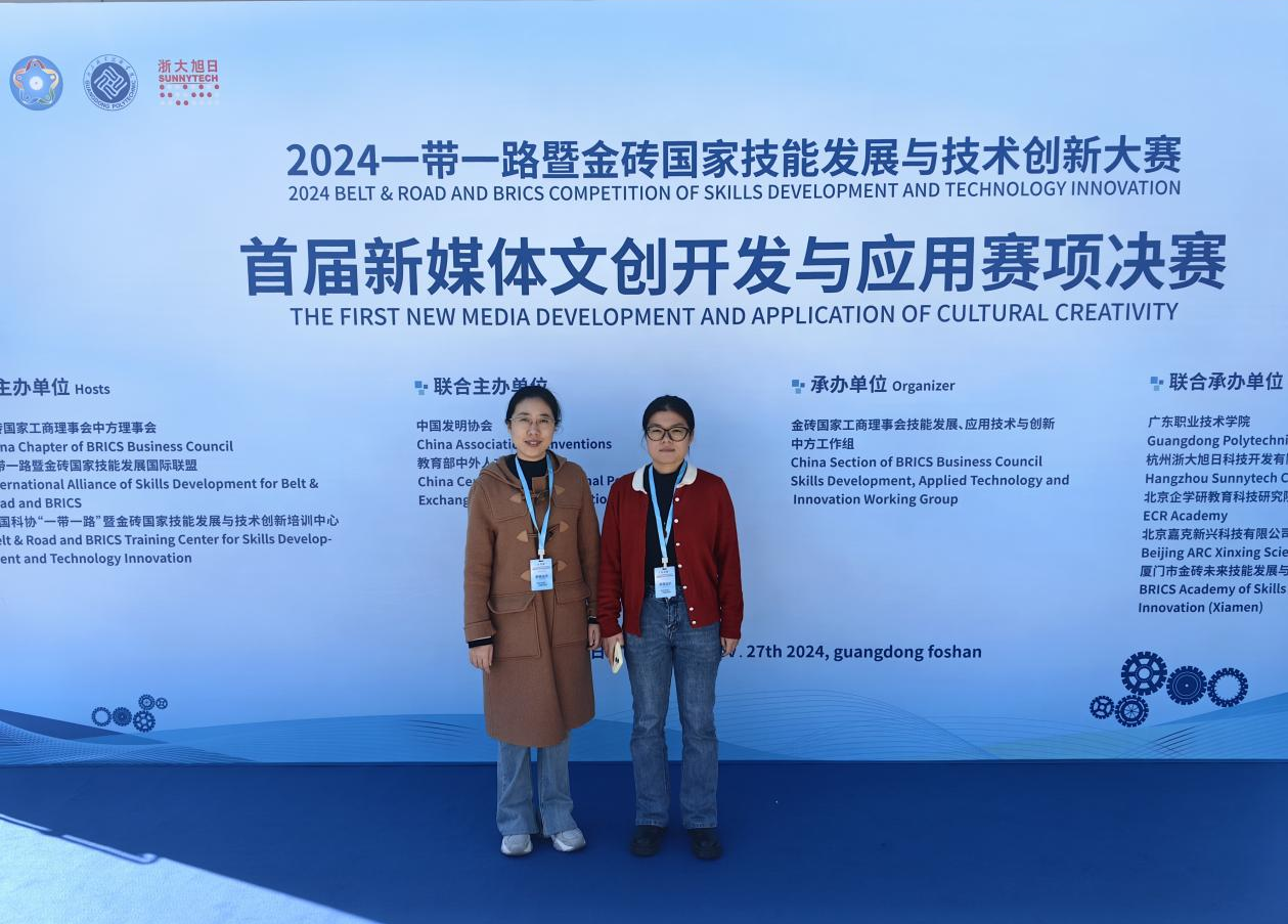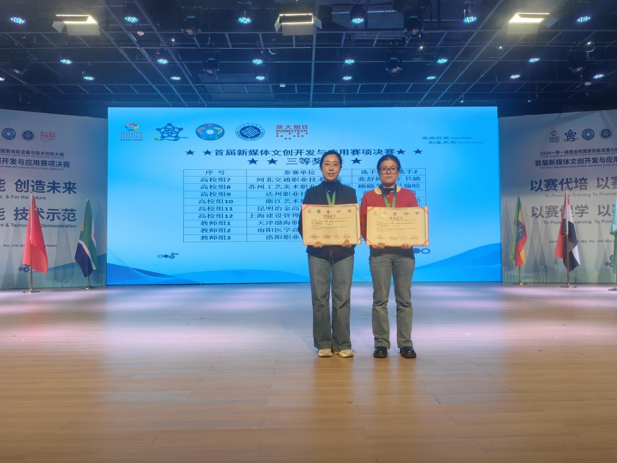 本网讯(文/护理系 何红丽)1127日至30日,备受瞩目的“一带一路”暨金砖国家技能发展与技术创新大赛首届新媒体文创开发与应用赛项在广东职业技术学院举行。经过激烈角逐,我校护理系教师李艳、李恒晓团队作为唯一一支来自医学类院校的参赛队伍,凭借出色的创意设计与精湛的专业技能,荣获教师组三等奖,为学校赢得了荣誉。