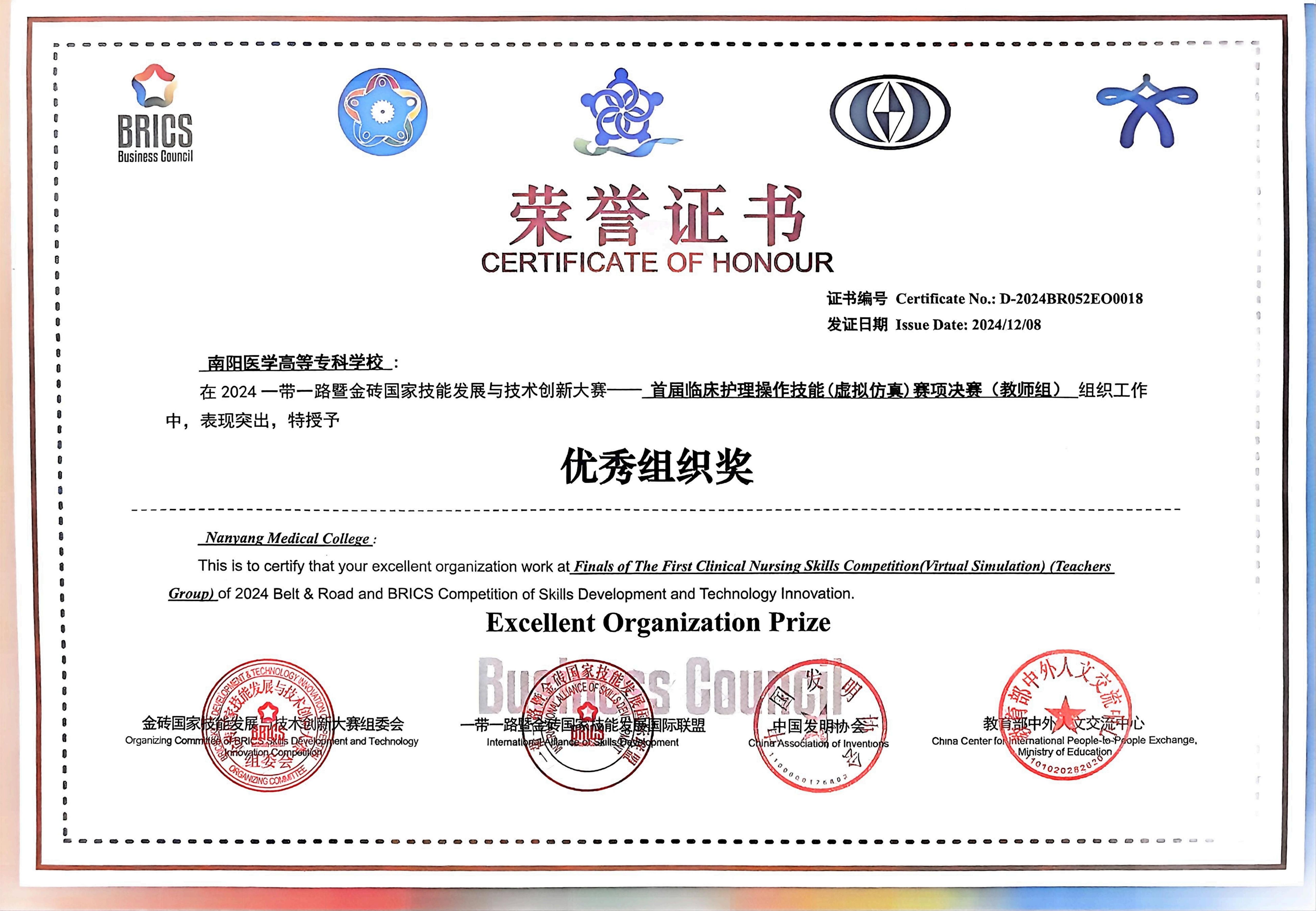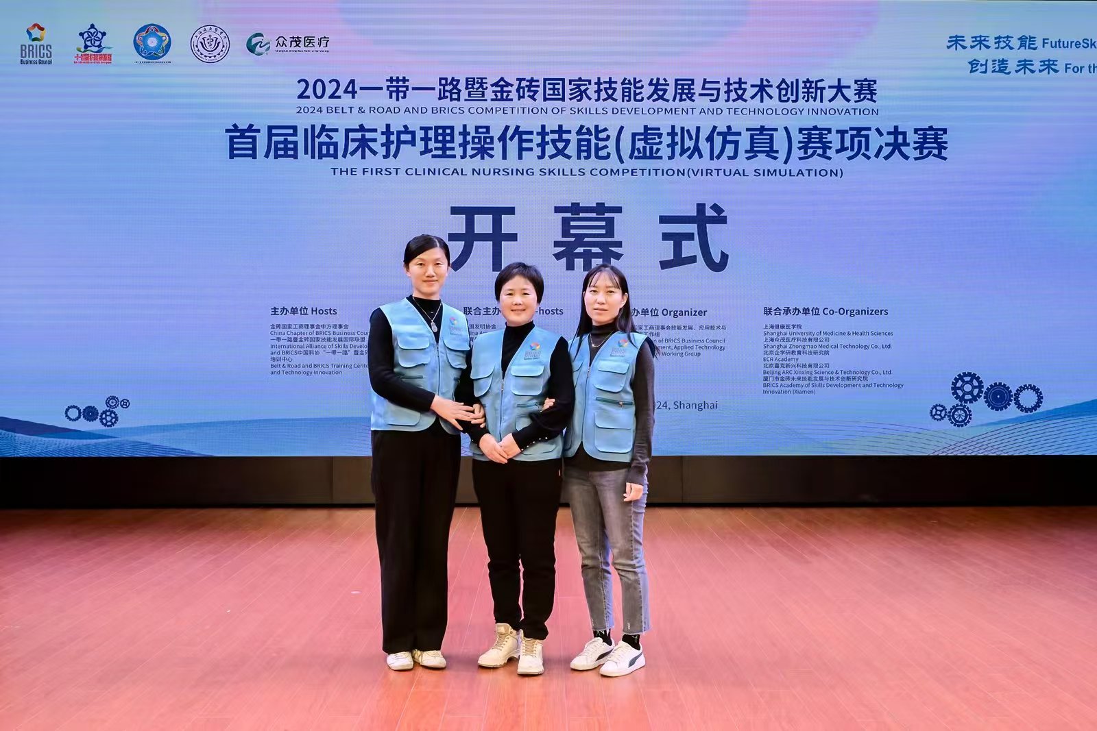 本网讯(文/护理系 何红丽)2024“一带一路”暨金砖国家技能发展与技术创新大赛首届临床护理操作技能(虚拟仿真)赛项于125日至8日在上海健康医学院举行。来自全国24个省市自治区院校的81个教师团队参加比赛。经过激烈角逐,我校护理系教师吴俊晓、赵梦媛、任崇团队以总分第8名的成绩荣获教师组二等奖,我校获得“优秀组织奖”。