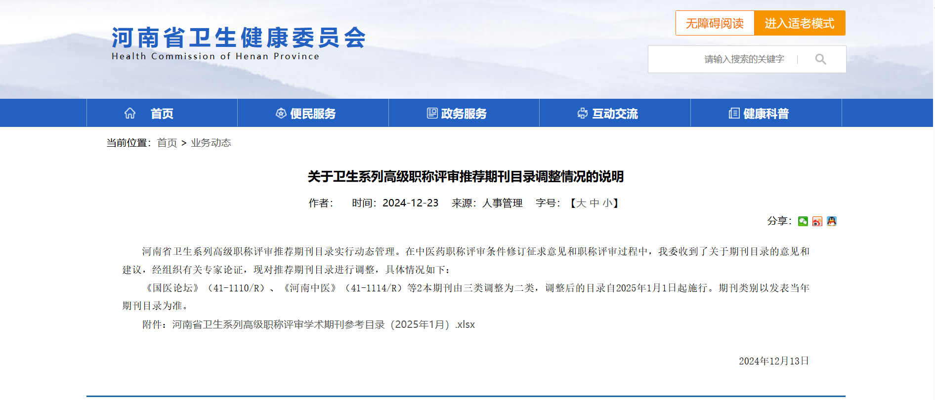 本网讯(文/国医论坛编辑部 魏怡晨)根据河南省卫生健康委员会发布的《关于卫生系列高级职称评审推荐期刊目录调整情况的说明》,《国医论坛》杂志自2025年1月1日起晋升为河南省卫生系列高级职称评审二类学术期刊。此次调整也标志着《国医论坛》杂志的学术质量和影响力有了质的提升。《国医论坛》杂志创刊于1986年,现由中华中医药学会、万象城网页版,万象城(中国)主办,河南省中医药管理局主管。2011年被评为河南省自然科学一级期刊。杂志被中国知网、万方数据、重庆维普、长江文库等多家国内知名数据库和文摘杂志收录,成为这些数据库和文摘的统计源期刊。《国医论坛》杂志入选AMI职院刊扩展版(2022版)。