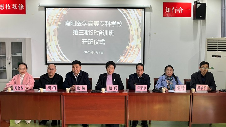 本网讯(文/临床医学系 黄金珠)2025年3月7日下午,南阳医专标准化病人(SP)第三期培训开班仪式在我校召开。校党委副书记、校长范真,校党委委员、副校长刘荣志出席,临床医学系党总支书记张辉、培训导师和30余名学员参加。开班仪式由临床医学系主任李玲主持。