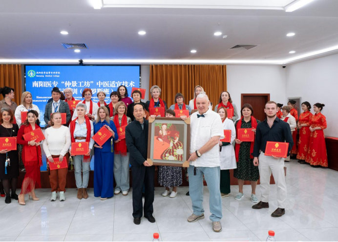 柳明伟祝贺学员们顺利结业,为学员颁发了结业证书。他在讲话中肯定了学员们的求知热情和乐学好学的精神,他指出,南阳医专以传承和弘扬仲景文化为己任,以国际化视野推动中医药文化传承创新发展,成功探索出一条独具特色的“职教出海”之路。本次培训根据学员需求,结合学校中医药优质教育资源,倾心打造了中医适宜技术系统培训课程。希望俄罗斯学员回国后能够成为在俄传播中医文化的使者和连接中俄交流的桥梁,祝愿中俄友谊长存。