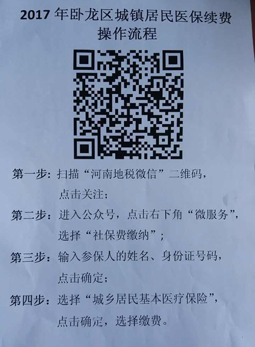 2018年城镇居民医疗保险交费续保工作已开始,医保缴费标准180元,缴费办法有三种,缴费时间2017年11月13日至12月31日。不按时交费续保所造成的报销中断等问题由自己负责。未登记参保的居民(包括新生婴儿),12月初需带户口簿、身份证到卧龙、武侯两个办事处医保办办理。